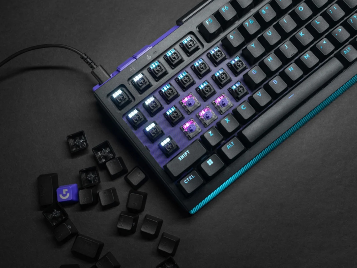 Utöver dessa 39 platser för magnetiska brytare finns 81 platser för mekaniska brytare som kan bytas ut och som är standardbestyckade med sådana. Det finns en Game Mode-knapp och en Analogue Scan-knapp, tillsammans med två rattar för ytterligare kontroller. Tack vare de magnetiska brytarna möjliggörs anpassad och flerpunktsaktivering, mellan 0,1 mm och 4 mm. I förpackningen ingår också fem ringar som möjliggör SAPP (Second Actuation Pressure Point), som tydligt markerar den andra aktiveringspunkten. Programvaran G Hub kan användas för att anpassa och ställa in unika ingångar för aktiveringspunkterna. Logitech använder dubbelslagna PBT-tangenter med genomskinlig text, och packningsfästet ger en dämpad ljudprofil. Det finns RGB-belysning per tangent och en ljusramp längst ned (framtill).