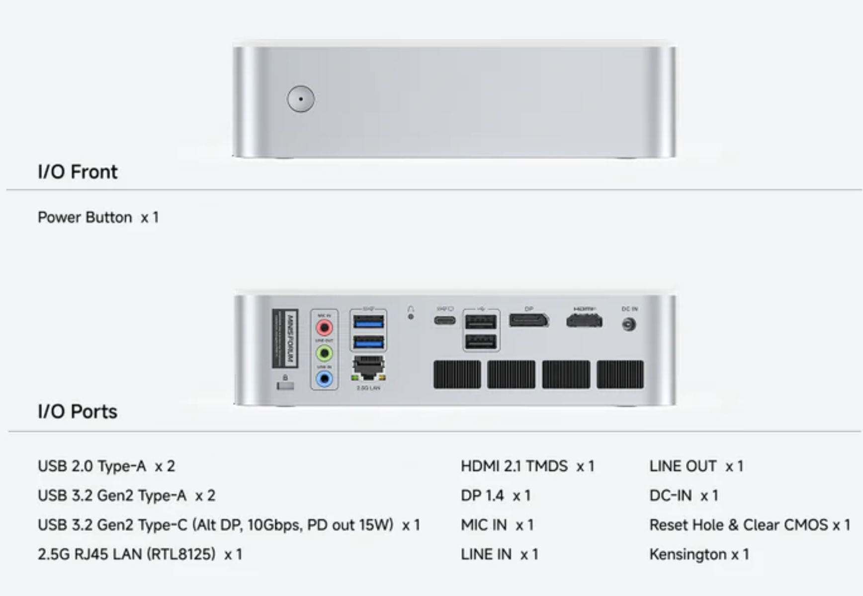 Dessutom stöder M1-1295 Bluetooth 5.2 och Wi-Fi 6E-anslutning via ett MediaTek MT7902 M.2 2230-modem, samt 2,5 Gigabit Ethernet med Realteks RTL8125-styrenhet. Mini-PC:n har också en mängd andra portar på baksidan, inklusive tre videoutgångar, som bilden nedan visar. För närvarande är förbeställda enheter något billigare på Amazon än på Minisforums webbplats. Däremot säljer Minisforum barebones-enheter för $ 329 direkt på sin webbplats. Med andra ord kostar barebone-enheter cirka 30% mindre än deras förkonfigurerade motsvarigheter.