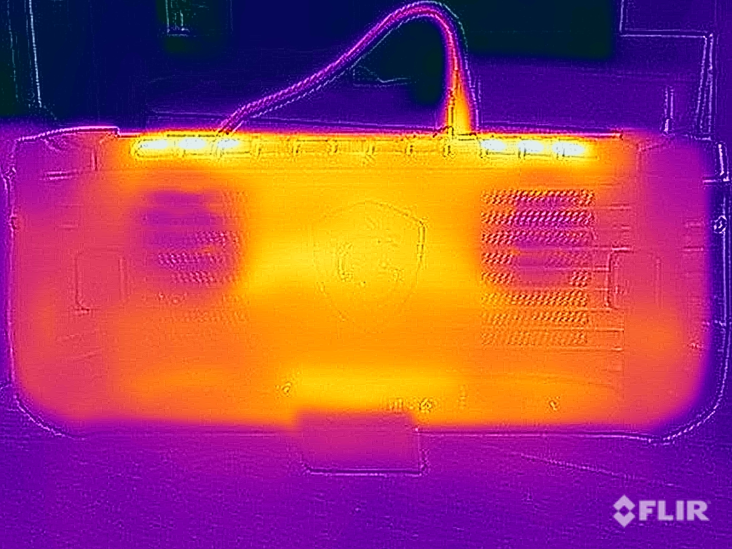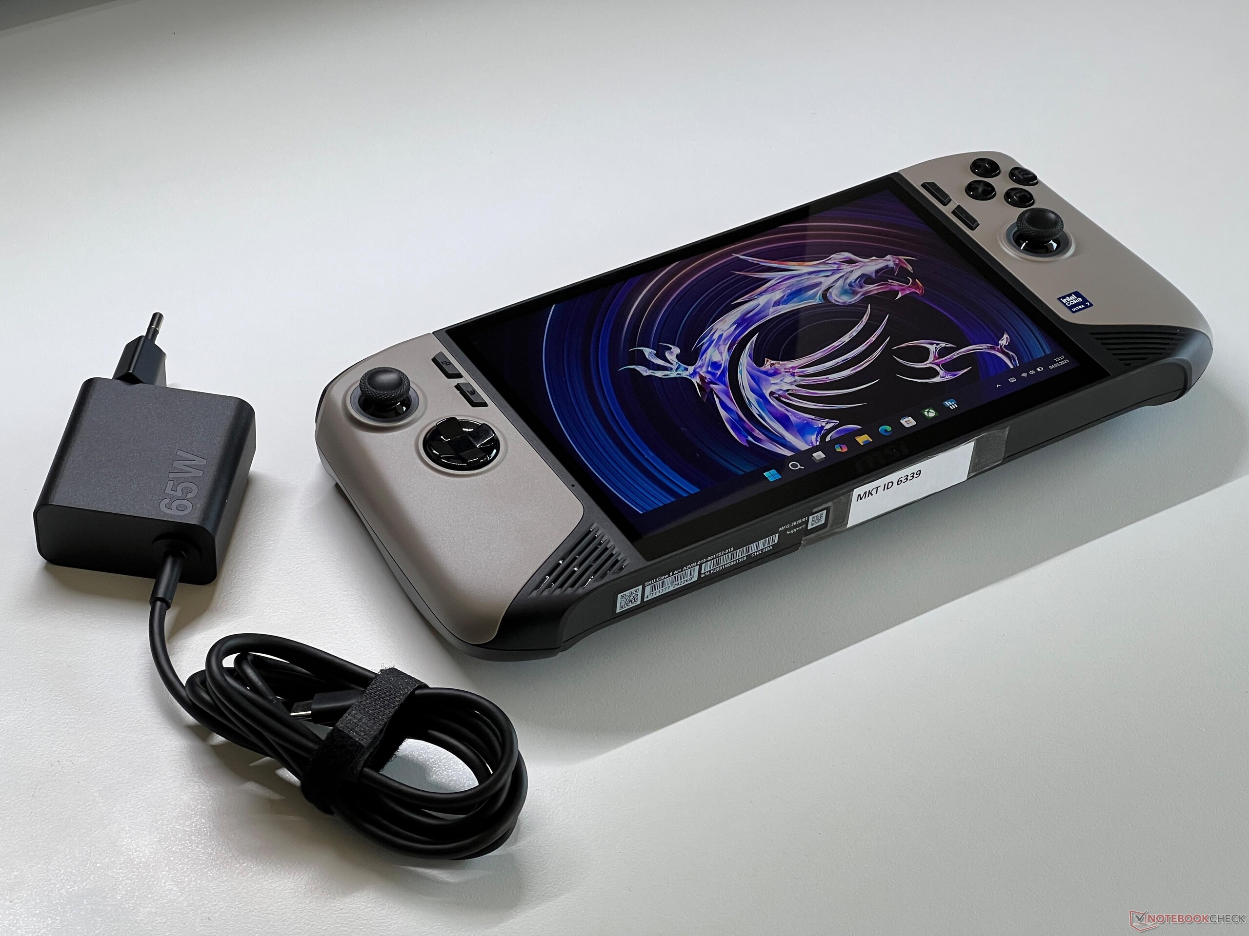 Trots sin större skärm är Claw 8 mer sparsam än sin föregångare och de andra konkurrenterna vid tomgångskörning. Vi uppmätte en maximal förbrukning på 59 watt i stresstestet, som sedan planade ut på 50 watt efter ungefär en minut. När vi spelade noterade vi cirka 46 watt. Den medföljande 65-watts plug-in-strömförsörjningen (192 gram) är därför tillräckligt stor.