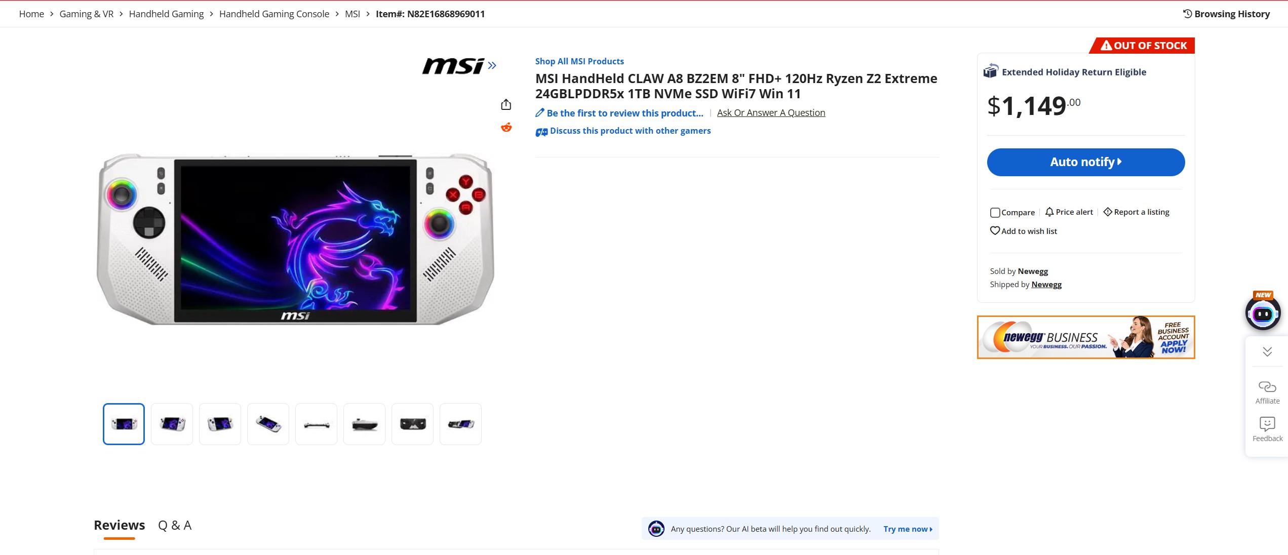 För att komma tillbaka till den listade Claw A8 på Newegg är kärnspecifikationerna desamma som de modeller som finns tillgängliga i andra regioner. Det inkluderar samma 80 Wh batteri, 2280 M.2 SSD (1 TB Samsung SSD 9100 curr. $ 175,99 på Amazon), 8-tums 120 Hz-skärm med VRR och WiFi 7. Även om det fortfarande inte finns något ord om när det kommer att finnas tillgängligt att köpa, eftersom det redan är listat, förväntas MSI formellt lansera det i USA snart.