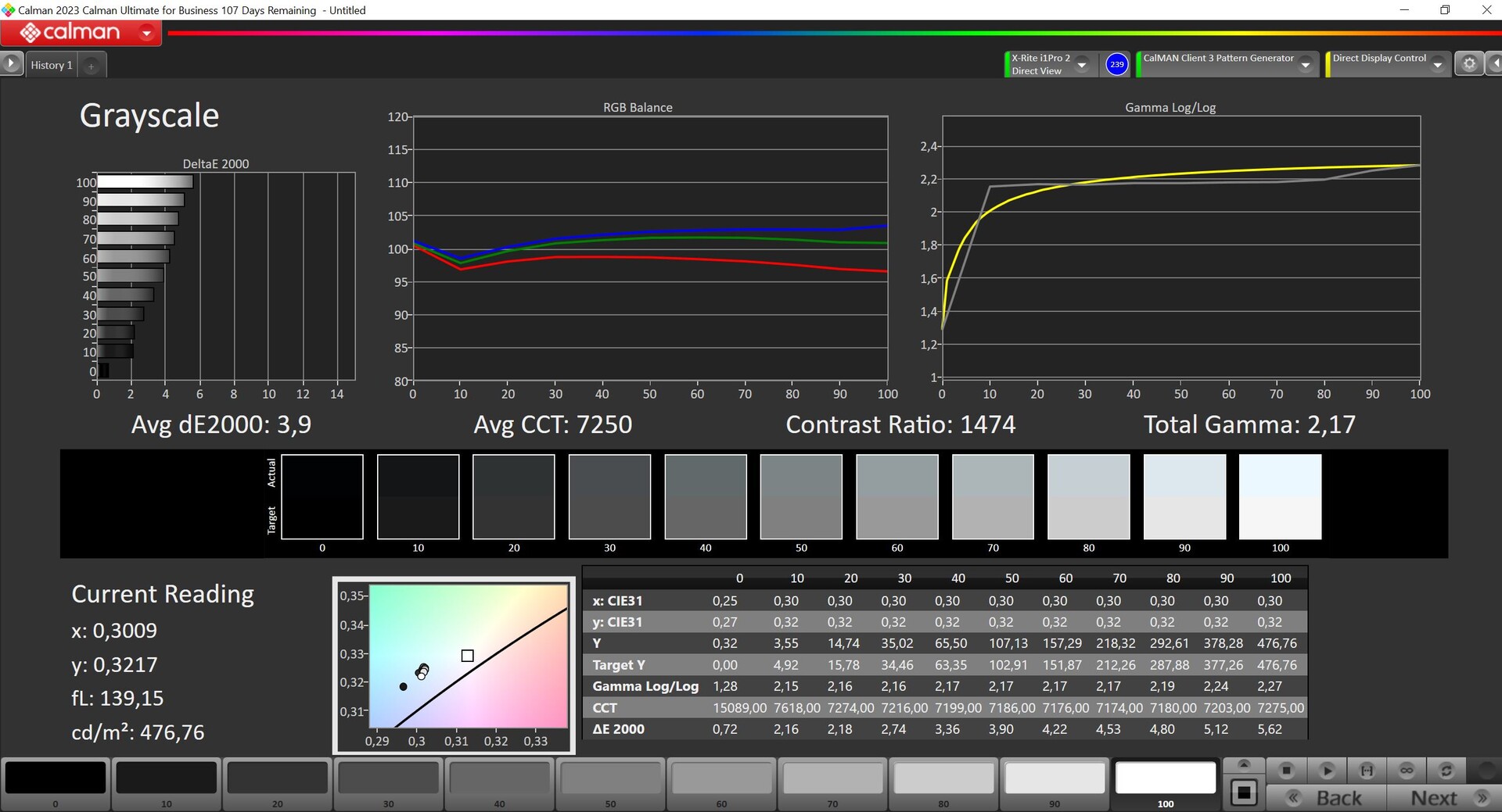 | Greyscale dE 2000 * | 3.9 | 2 49% | 0.92 76% | 5.1 -31% | 6.12 -57% | 9 -131% |