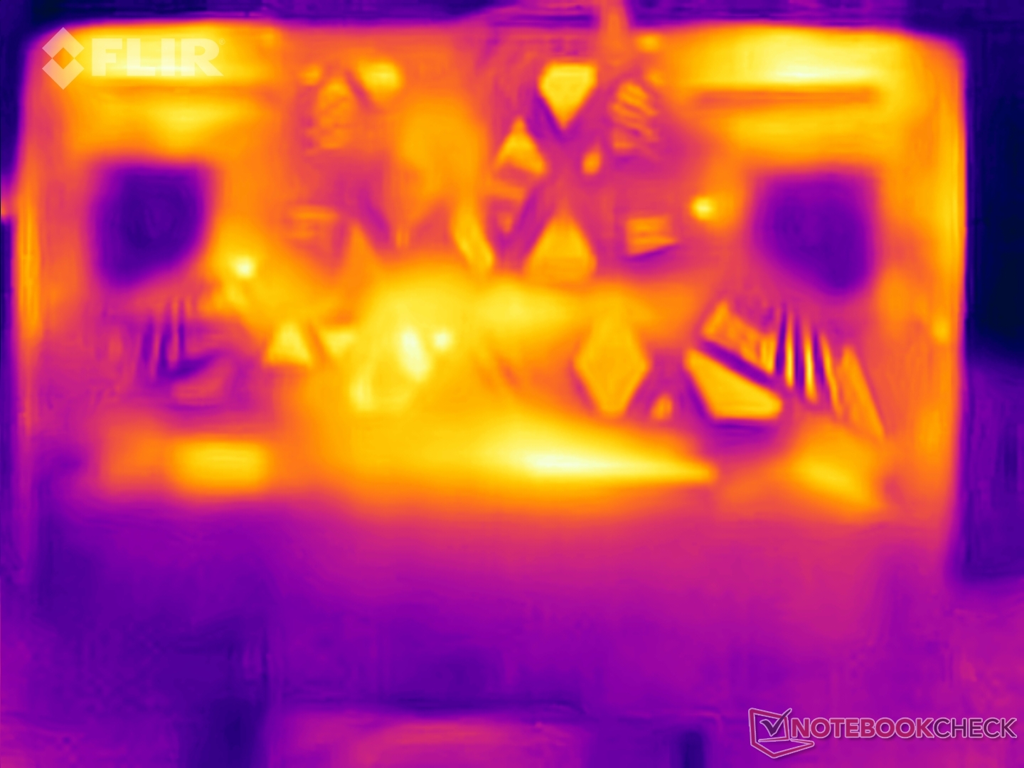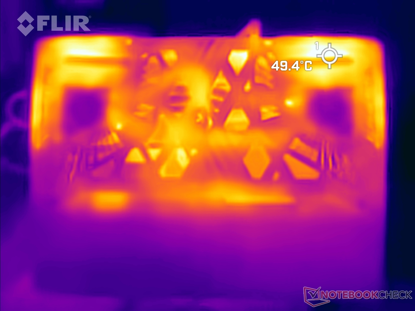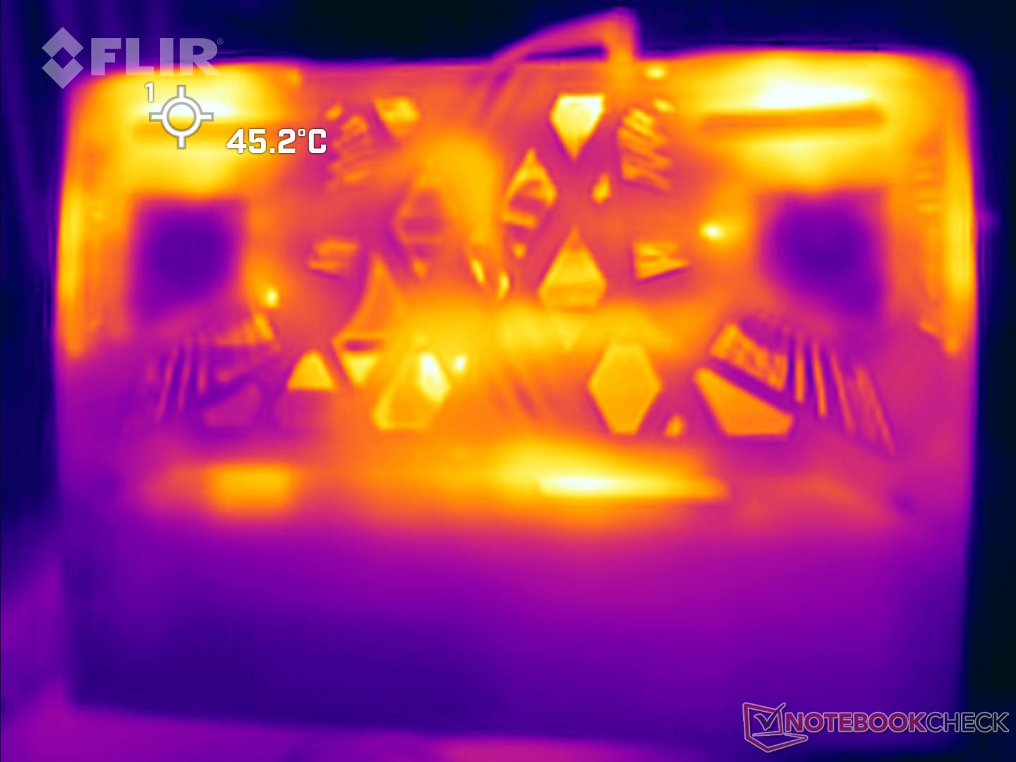 Yttemperaturen kan nå upp till 45 °C på ovansidan och nästan 49 °C på undersidan under belastning i Extreme Performance-läget.