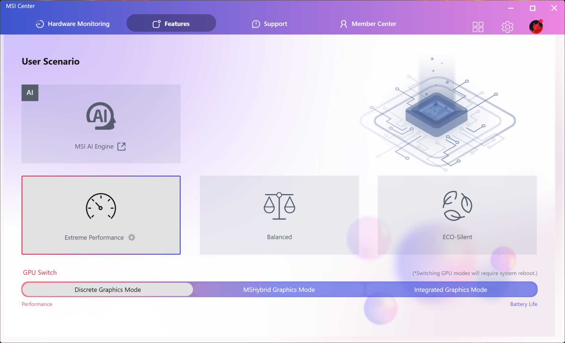 Extreme Performance-läget släpper lös den fulla potentialen hos Crosshair 16 HX AI, men det kommer med ökad värme och ljudutsläpp tillsammans med högre strömförbrukning.