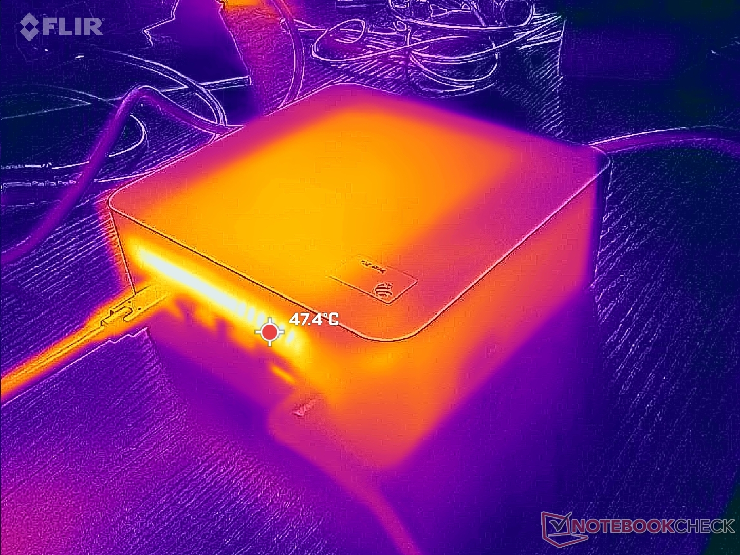 Till skillnad från de flesta andra minidatorer saknar Cubi NUC M1 ventilationsgaller på nästan alla sidor utom på undersidan och baksidan. Den strömsnåla U-seriens CPU innebär dock att yttemperaturerna ändå inte borde vara något problem. Den heta punkten på ovansidan skulle hålla sig under 30 C även när man kör krävande belastningar under långa perioder.