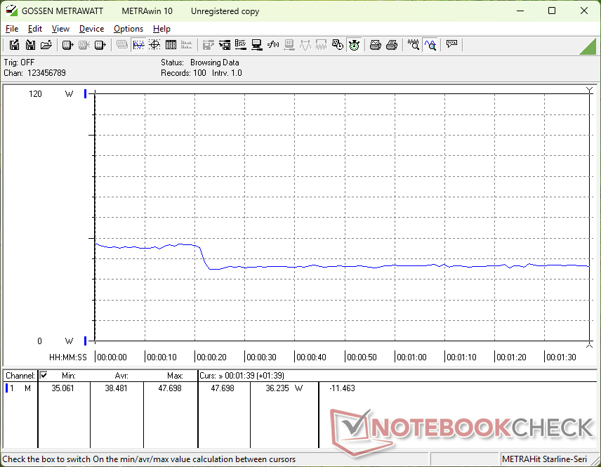 Förbrukningen är i allmänhet lägre än för de flesta H-drivna minidatorer, särskilt när man kör krävande belastningar. Framför allt levereras systemet med en rejäl 120 W AC-adapter trots att minidatorn knappt drar hälften vid 100 procents CPU-användning. Det höga effektuttaget kan användas för att driva Thunderbolt-tillbehör eller andra externa enheter.