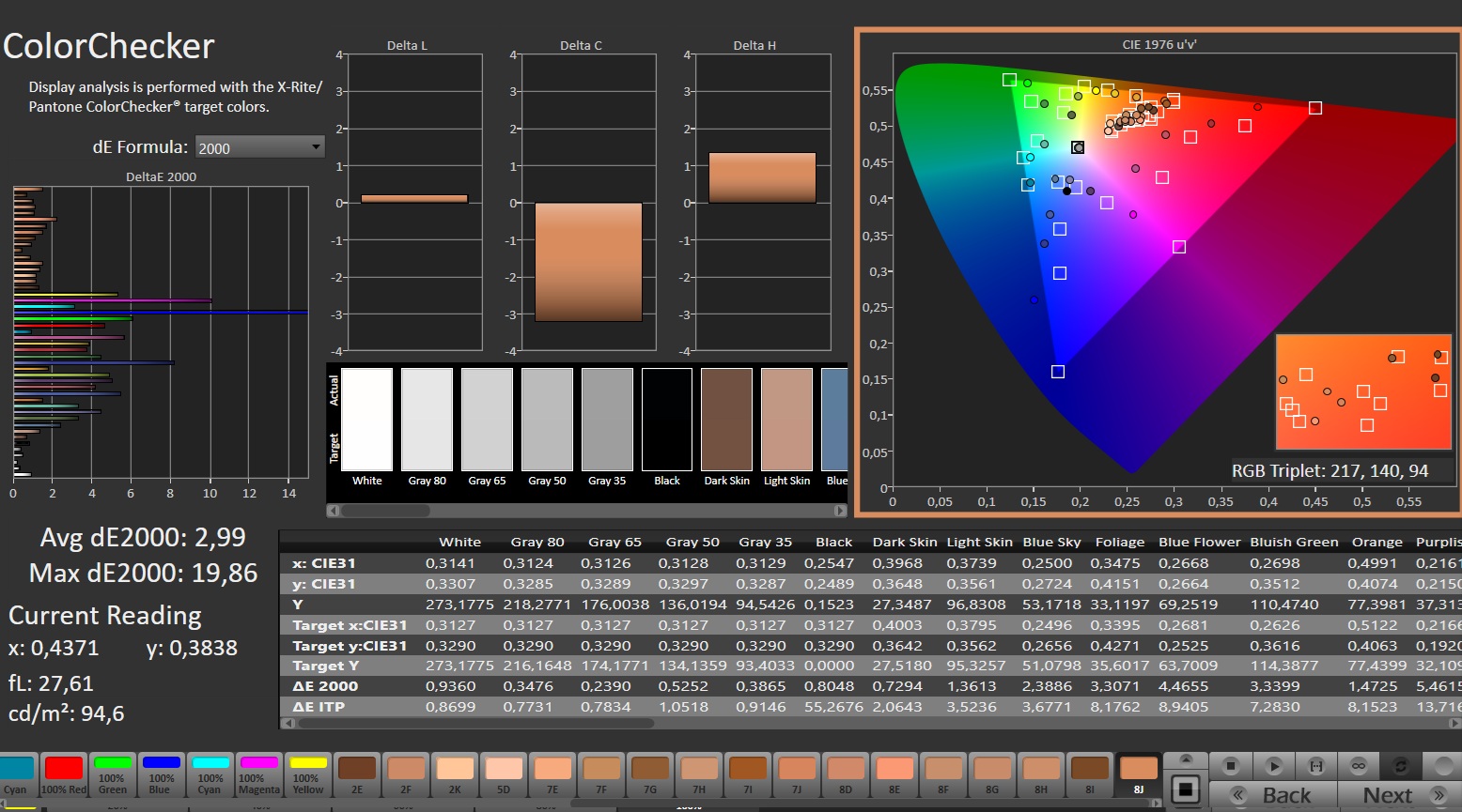 | Colorchecker dE 2000 calibrated * | 2.99 | 3.94 -32% | 3.56 -19% | 2.93 2% | 0.94 69% | |