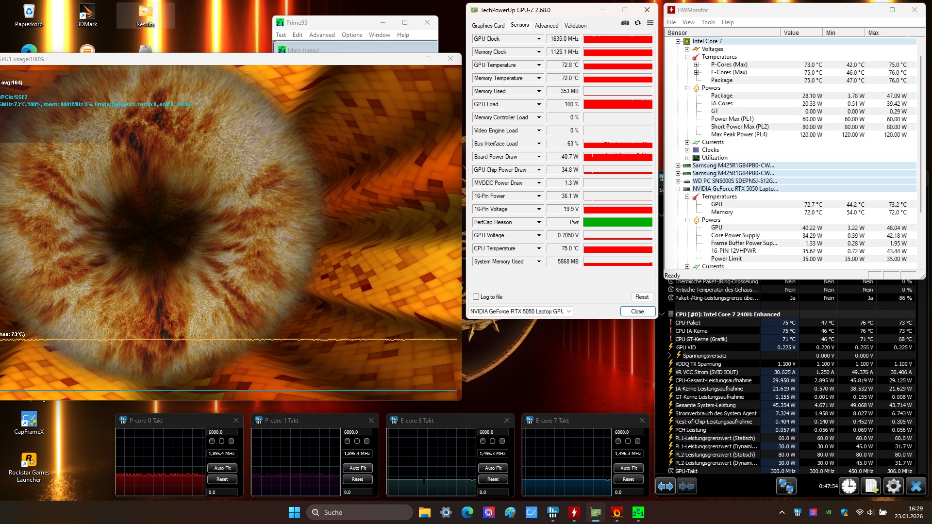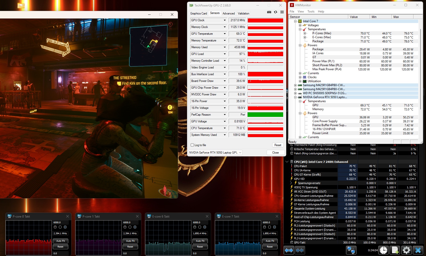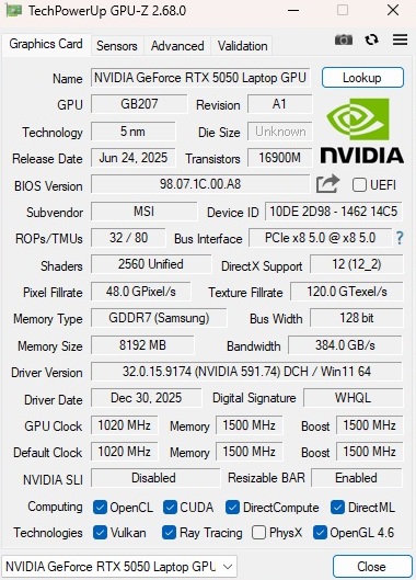 Grafikkortets kraft är också värt att diskutera: Eftersom MSI bara ger RTX 5050 en mager 45 watt TGP, faller GPU-prestandan under sin potential, som vi kommer att visa under artikelns gång, även om bullerutvecklingen är begränsad. Resten av utrustningen är solid, men inte överdådig för priset, med en Core 7 240H, 16 GB DDR5 RAM (2x 8 GB) och en 512 GB SSD. Samtidigt finns det pluspoäng för webbkamerans sekretesslucka, vilket inte är en självklarhet för bärbara speldatorer i synnerhet.