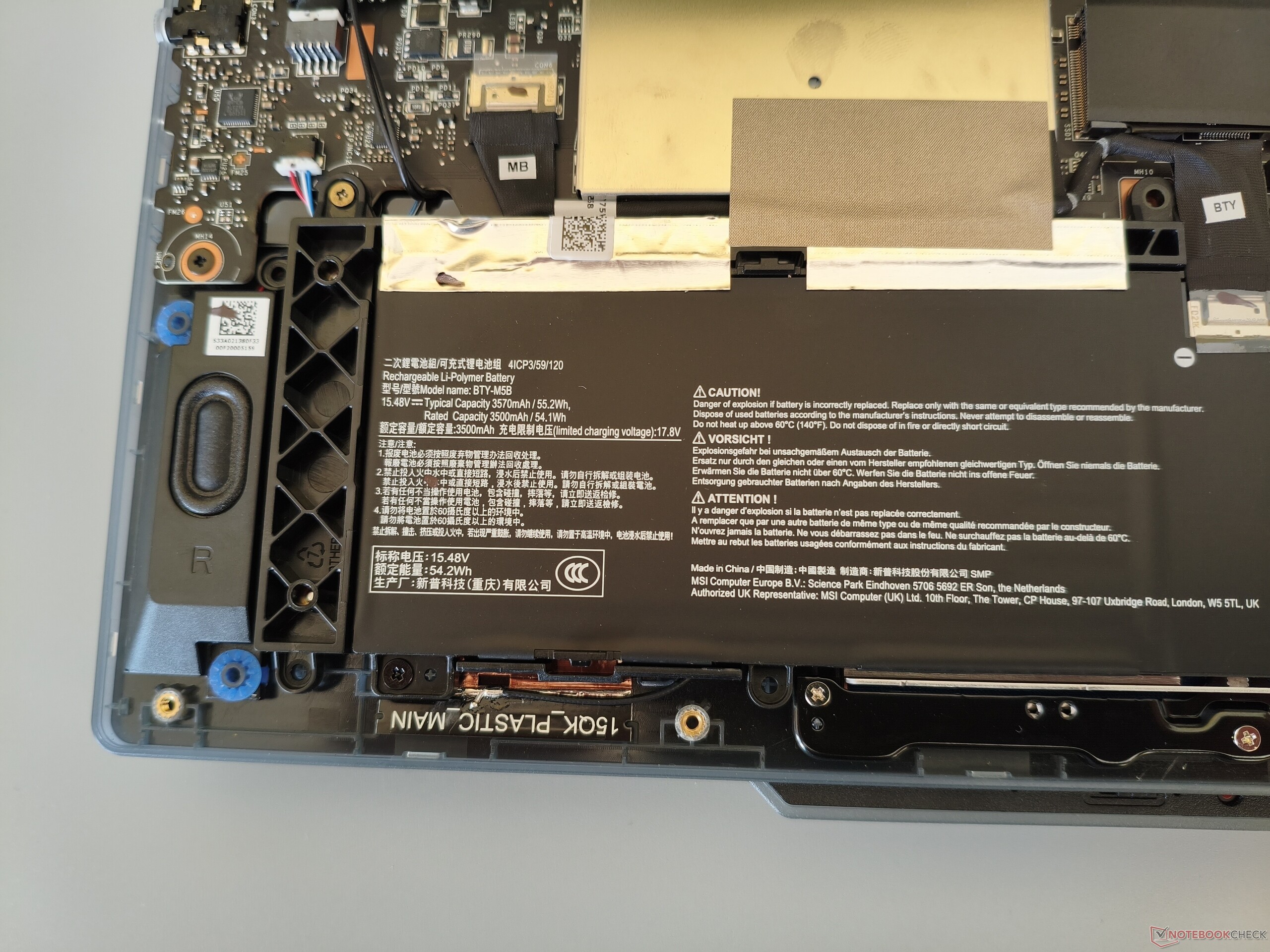 Höljet består av en blandning av metall (locket) och plast (basenheten). För det mesta ger utförande och stabilitet ingen anledning till kritik. MSI förtjänar särskilt beröm för den generösa öppningsvinkeln på 180°. Med en vikt på strax under 2,2 kg (~4,9 lbs) ligger Cyborg 15 bekvämt i mitten av konkurrenterna, som väger mellan 1,9 och 2,4 kg (~4,2 och 5,3 lbs). För att öppna höljet måste 12 Phillips-skruvar tas bort. Du kan ta reda på hur det ser ut under huven i bilderna nedan.