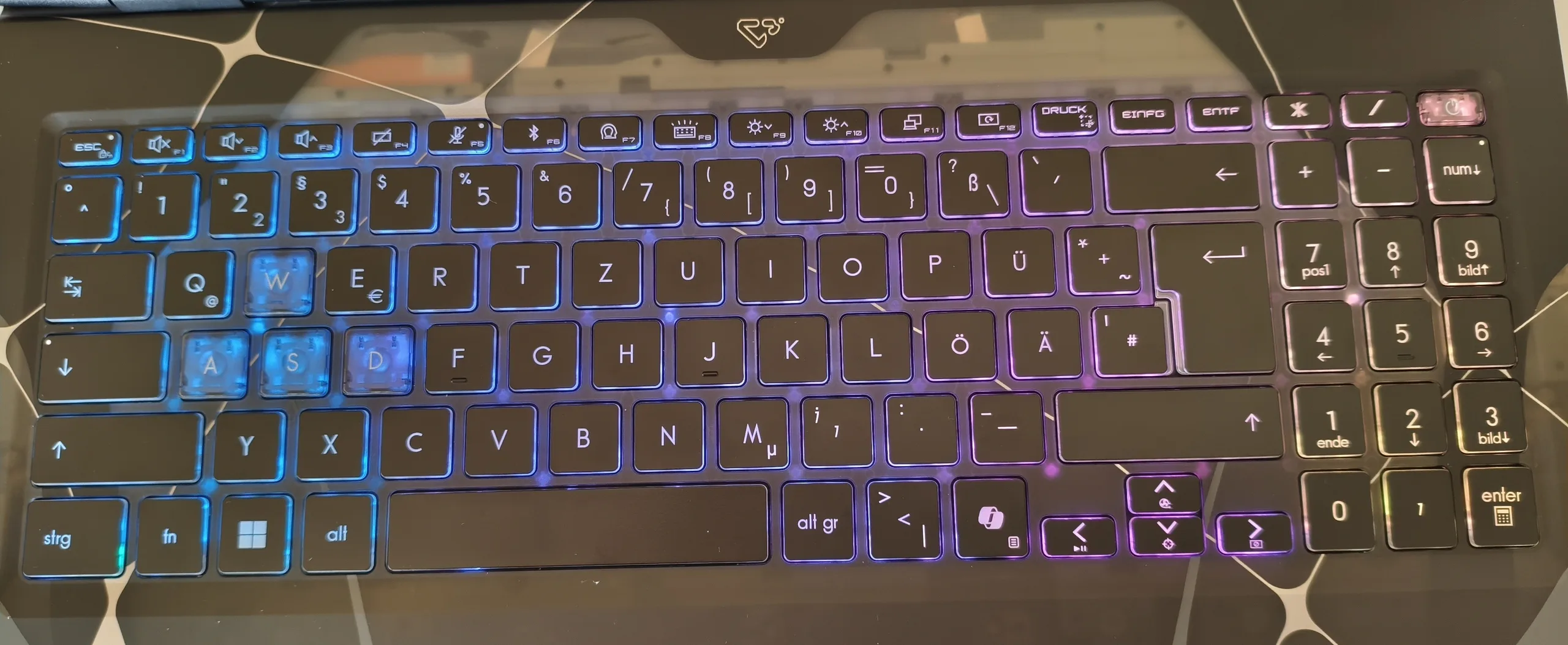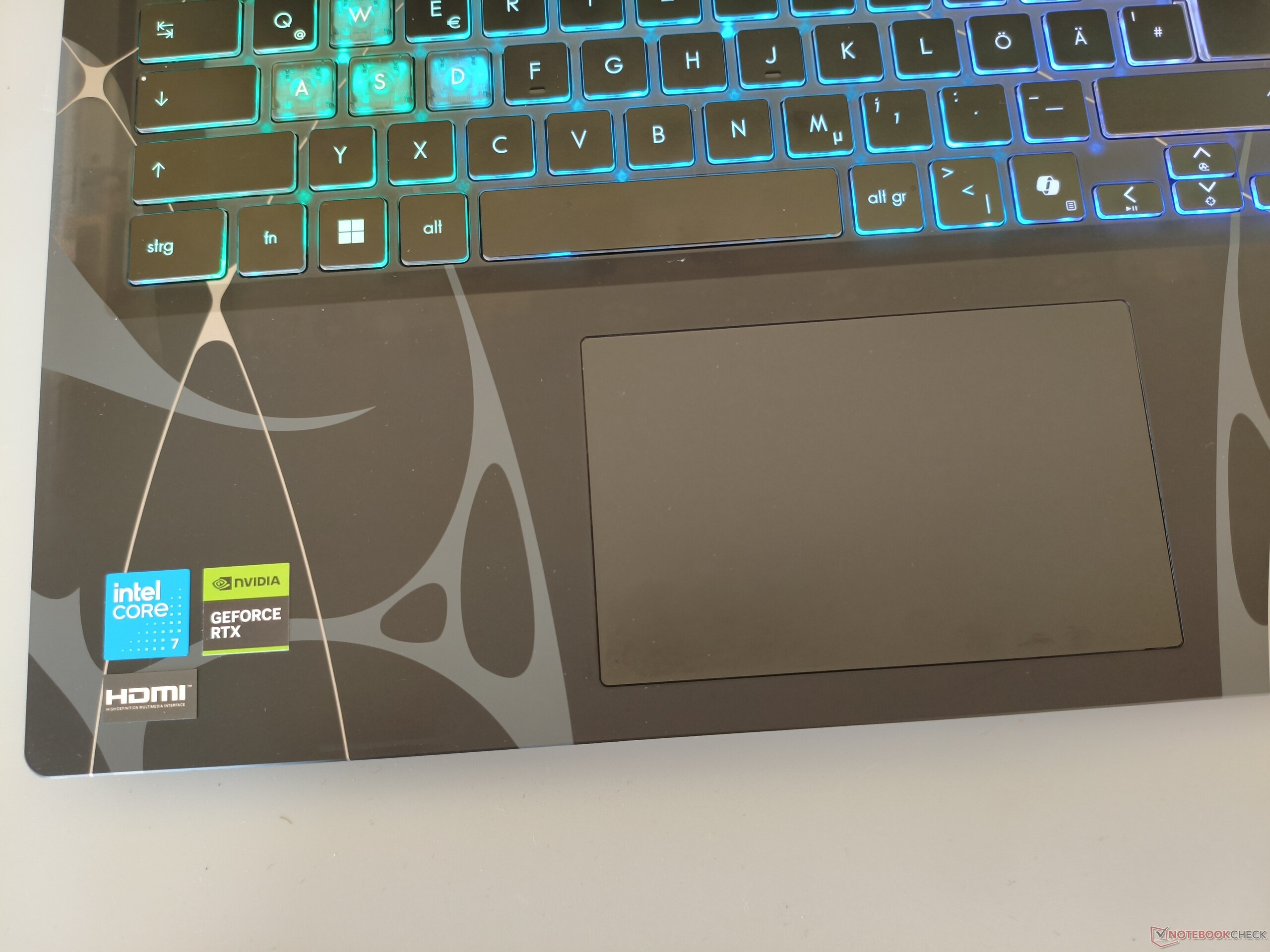 Tangentbordet kräver en viss tillvänjning på grund av den idiosynkratiska layout som är typisk för MSI. Det faktum att den numeriska knappsatsen bara har tre kolumner istället för fyra tar också lite att vänja sig vid. Vi skulle beskriva själva skrivkänslan som solid. Spelare kan också se fram emot relativt kraftfull RGB-belysning. Pekplattan mäter 12 x 7,6 cm (~4,7 x 3,0 in), vilket är mer än tillräckligt för en 15-tums enhet. Musbytet presterar på en tillfredsställande nivå i testet när det gäller precision, glidegenskaper och gester.