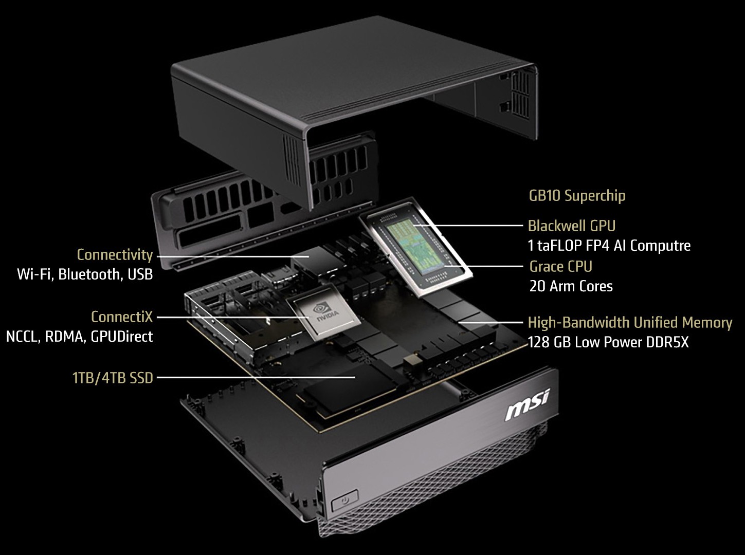 Specifikationerna för 99SUS 1 TB är i stort sett desamma som för originalet MS-C931, förutom att Bluetooth-versionen har nedgraderats från 5.4 till 5.3. Annars drivs den av GB10 superchipet med en Blackwell GPU som kan bearbeta 1 PetaFLOP av FP4 AI-instruktioner plus en Grace CPU med 10 ARM Cortex-X925-kärnor och 10 ARM Cortex-A725-kärnor. Superchipet kompletteras av 128 GB LPDDR5X unified systemminne med 273 GB/s bandbredd. CPU och GPU kan båda komma åt LPDDR5X RAM-poolen via en NVLink C2C-sammankoppling som erbjuder 5x PCIe 5.0-bandbredd. När det gäller lagring tillhandahåller MSI 1 eller 4 TB NVMe SSD-alternativ. Chassit mäter 151 x 151 x 52 mm (1,19 l volym) och väger 1,2 kg.