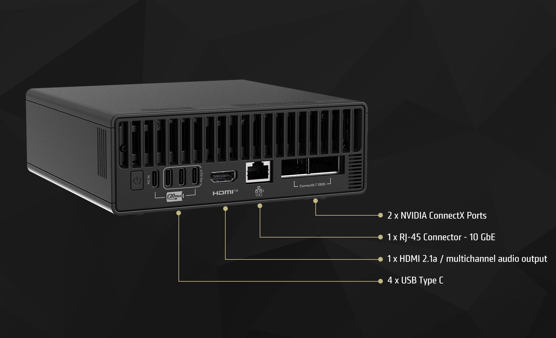 Portutbudet inkluderar 4X USB-C 3.2 20 Gbps-portar med PD-funktionalitet, en HDMI 2.1a videoutgång med flerkanalig ljudutgång, en 10 GbE NIC och 2x Nvidia ConnectX-7. Trådlös anslutning säkerställs via ett Wi-Fi 7 + BT 5.3-kort.