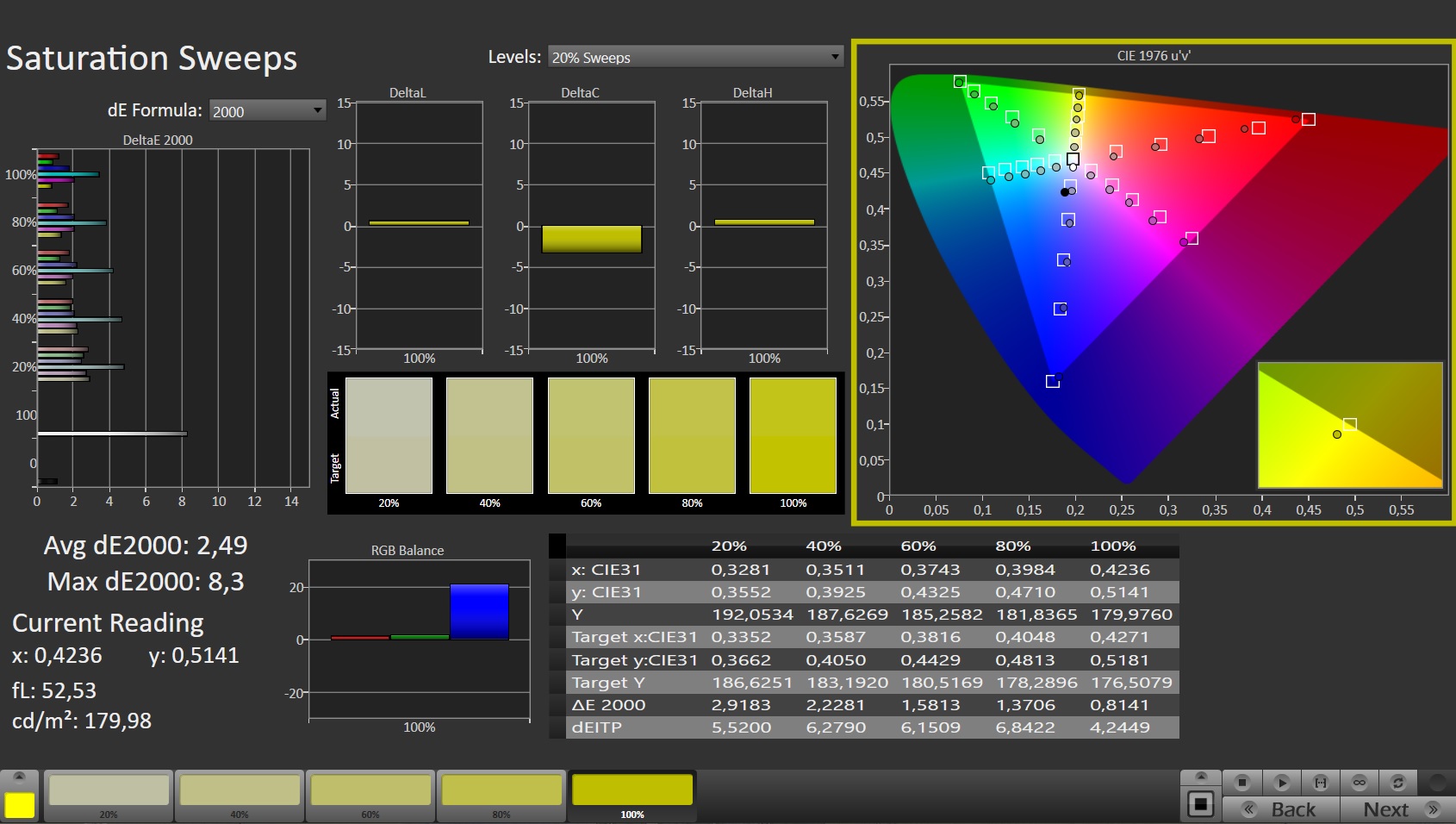 Färgnoggrannheten hos displayen kan förbättras, särskilt i gråskala. Efter kalibrering med fotospektrometern uppnådde vi mycket goda genomsnittliga DeltaE-värden för gråskala och färg på 0,8 respektive 0,67. ICC-profilen från vår kalibrering finns tillgänglig för nedladdning här.
