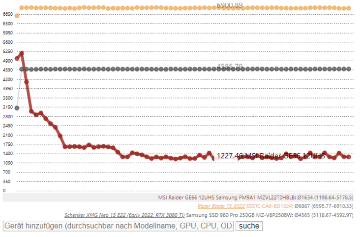 En annan positiv aspekt är det förbättrade kylsystemet. Den automatiska, AI-stödda fläktkontrollen ger en bra kompromiss mellan prestanda och buller. Tyvärr kan systemet inte leda bort den genererade värmen tillräckligt snabbt under längre spelsessioner, vilket leder till prestandaförluster på cirka 10 %. Men återigen kan detta problem lösas genom att manuellt ställa in fläktarna på full hastighet (Cooler Boost). MSI Center kan användas för att styra många av den bärbara datorns kärnfunktioner och ger användaren användbara tilläggsfunktioner. MSI Center fortsätter dock att vara felbenägen, kraschar slumpmässigt i våra tester och återställer tidigare inställda prestandaprofiler. Vi observerade också prestandaförluster på upp till 80 % i den installerade Samsung PM9A1 SSD under kontinuerlig belastning