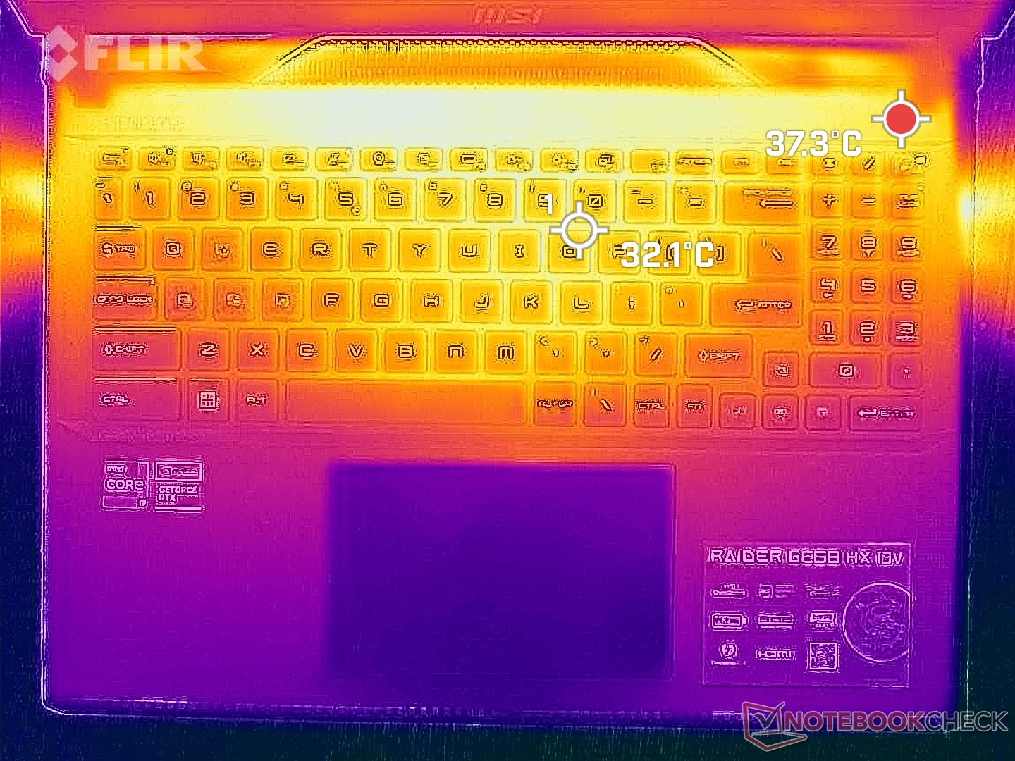 Ytans temperaturutveckling är symmetrisk på grund av hur kylningslösningen är utformad. Tangentbordets mittpunkt kan nå upp till 40 C vilket är mycket svalare än vad vi registrerade på HP Omen 16 eller Legion Slim 7i 16 G8 där hotspots kan vara upp till 45 till 50 C vardera. De generellt högre fläktarna och tjockare byggnaden av GE68HX arbetar till förmån för MSI ur detta perspektiv.