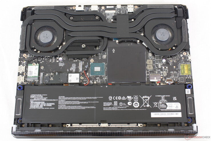 Användare har direkt tillgång till två M.2 2280-lagringsfack, två DDR5 SODIMM-kortplatser, WLAN-modulen och batteriet en gång inuti.