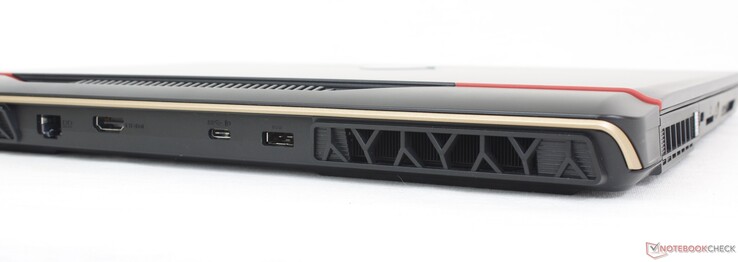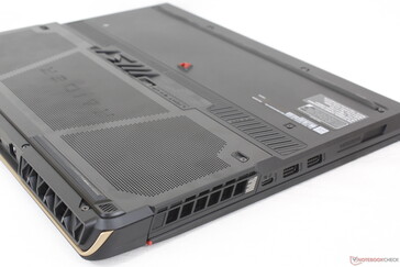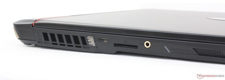 Portalternativen har ändrats något från förra årets GE67HX. Medan GE67HX skulle ha 3x USB-A-portar och 2x USB-C-portar, levereras GE68HX med 2x USB-A-portar och 3x USB-C-portar. Alla tre USB-C-portarna stöder Displayport, men endast den längs den vänstra kanten är kompatibel med Thunderbolt 4.