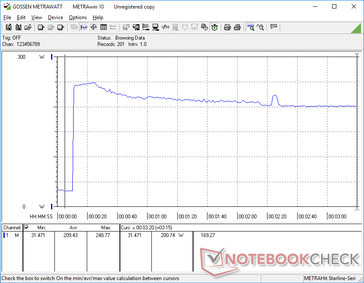 Vi kunde registrera en tillfällig maximal förbrukning på 365 W från den stora (~18 x 8,5 x 3,5 cm) 280 W AC-adaptern när vi startade både Prime95- och FurMark-stressen. Denna hastighet skulle falla och stabiliseras på cirka 204 W efter bara några sekunder, vilket visas i graferna nedan. MSI har ännu inte infört GaN-laddning till skillnad från de senaste bärbara Razer Blade-datorerna.