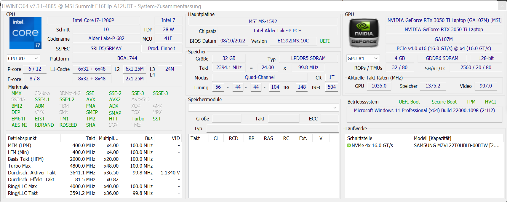 | MSI Summit E16 Flip A12UDT-031 GeForce RTX 3050 Ti Laptop GPU, i7-1280P, Samsung PM9A1 MZVL22T0HBLB | Asus ExpertBook B2 Flip B2502FBA-N80141X Iris Xe G7 96EUs, i7-1260P, Samsung PM9A1 MZVL21T0HCLR | Samsung Galaxy Book Pro 360 15 NP950QDB-KC3DE Iris Xe G7 80EUs, i5-1135G7, Samsung PM991 MZVLQ256HAJD | Dell Inspiron 16 7620 2-in-1 Iris Xe G7 96EUs, i7-1260P, Toshiba KBG40ZNS512G NVMe | |