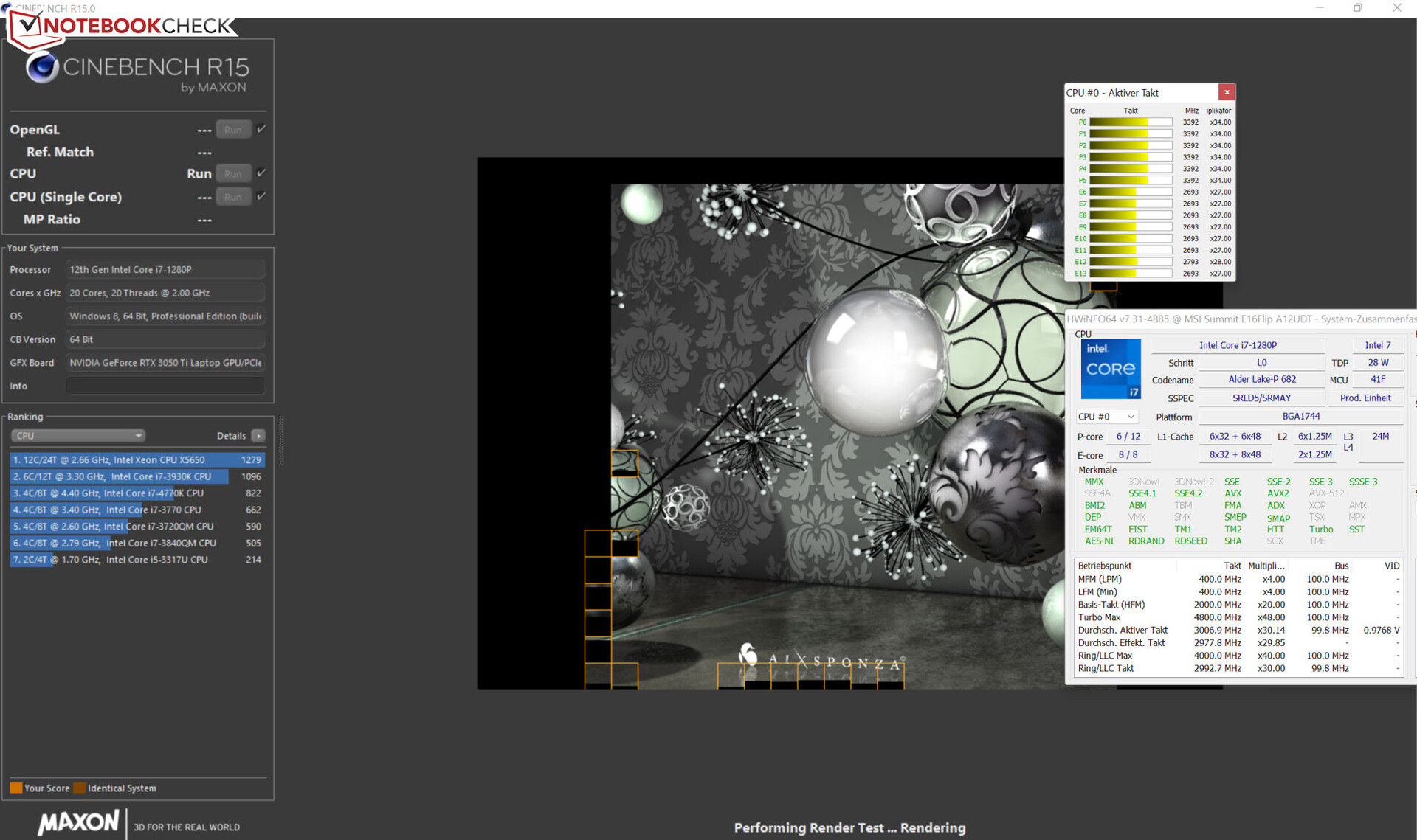 Processorn körs genom multitrådstestet i riktmärket Cinebench R15 med klockfrekvenser i det medelstora Turbo-området (P: 3,3 - 3,4 GHz, E: 2,8 - 2,9 GHz). I testet med en tråd används den fulla Turbo-klockfrekvensen (P: 3,5 - 4,8 GHz, E: 400 MHz - 3,5 GHz). Vid batteridrift är klockfrekvenserna minimalt lägre. Vi använder profilen "High Performance" här. Vid användning av de andra tre strömprofilerna är klockfrekvenserna delvis betydligt lägre