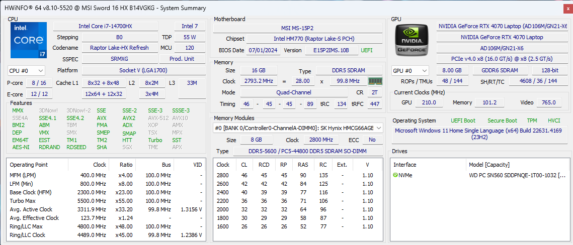 MSI Sword 16 HX ligger i mitten av företagets repertoar och syftar till att balansera pris och prestanda. Denna speciella variant levereras med potent hårdvara inklusive Raptor Lake HX-baserad Intel Core i7-14700HX, Ada Lovelace-baserad Nvidia GeForce RTX 407016 GB DDR5-5600 RAM och 1 TB inbyggt lagringsutrymme.