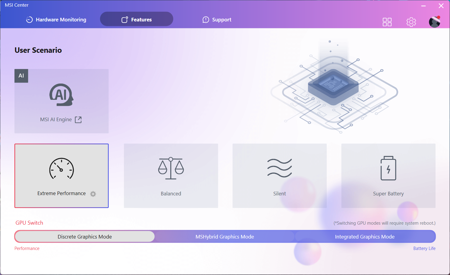 Den dedikerade funktionstangenten kan användas för att komma åt vanliga funktioner som profilbyte direkt, ljud, skärmens ljusstyrka och tangentbordets bakgrundsbelysning. MSI Centre låter dig byta ut "Win"- och "Fn"-tangenten.