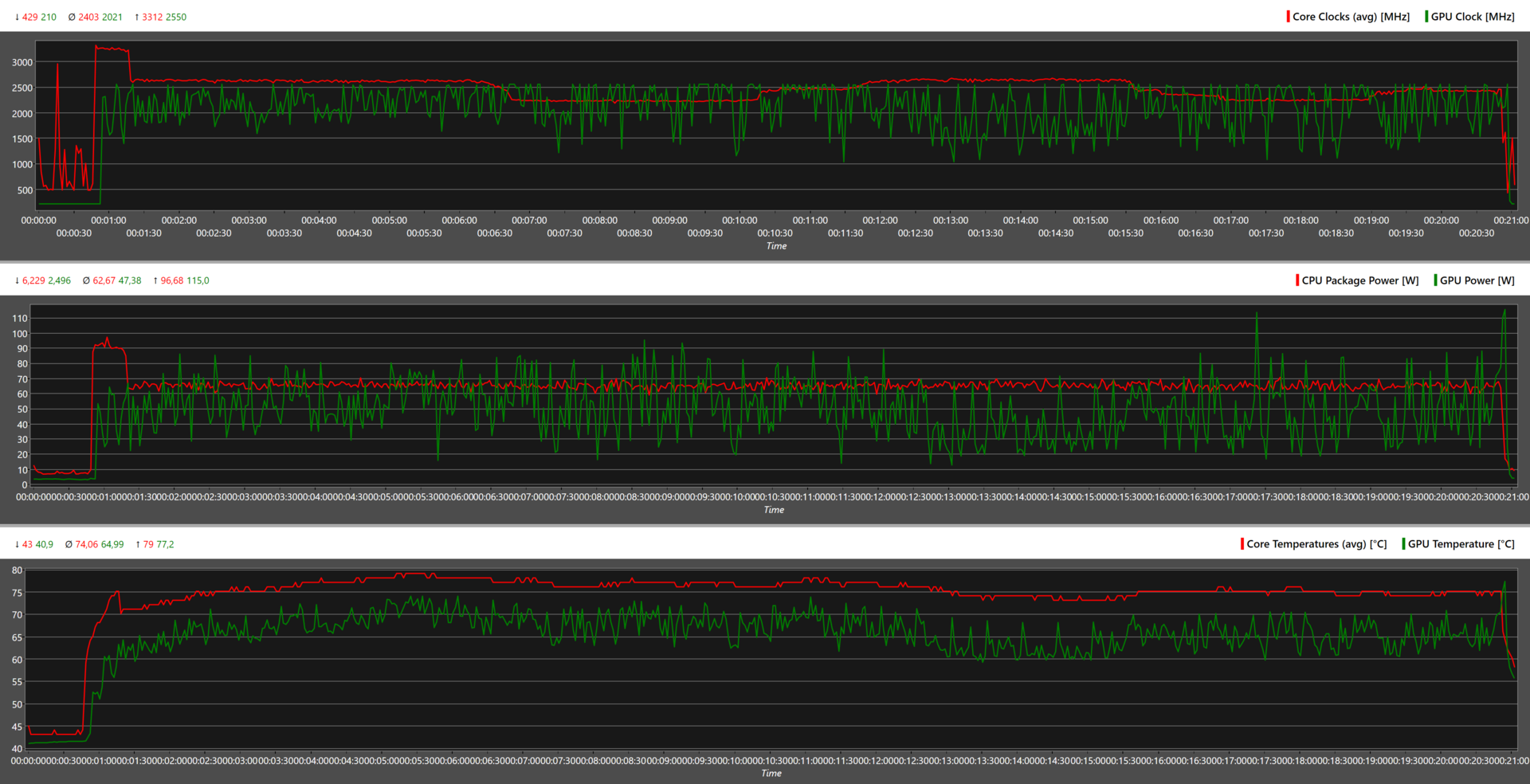 CPU och GPU kämpar om kraften, med den förra som drar en stadig 62 watt och den senare försöker hårt för att nå sin 115 watt topp.