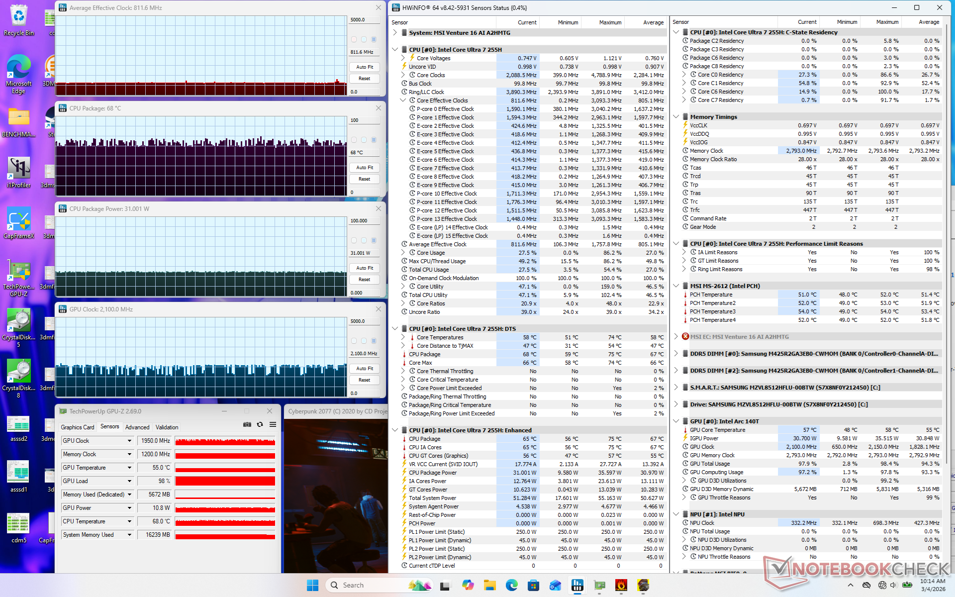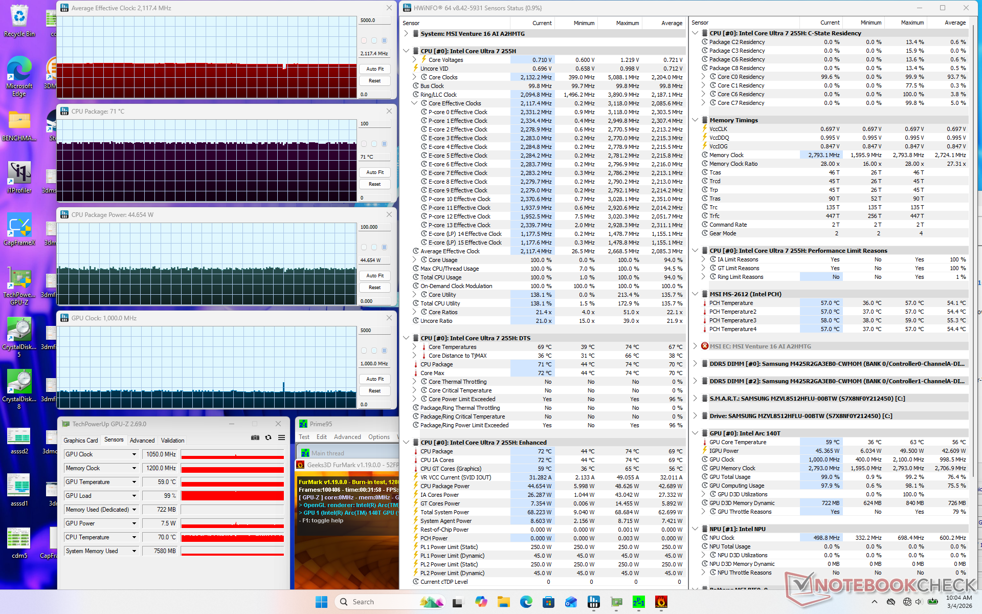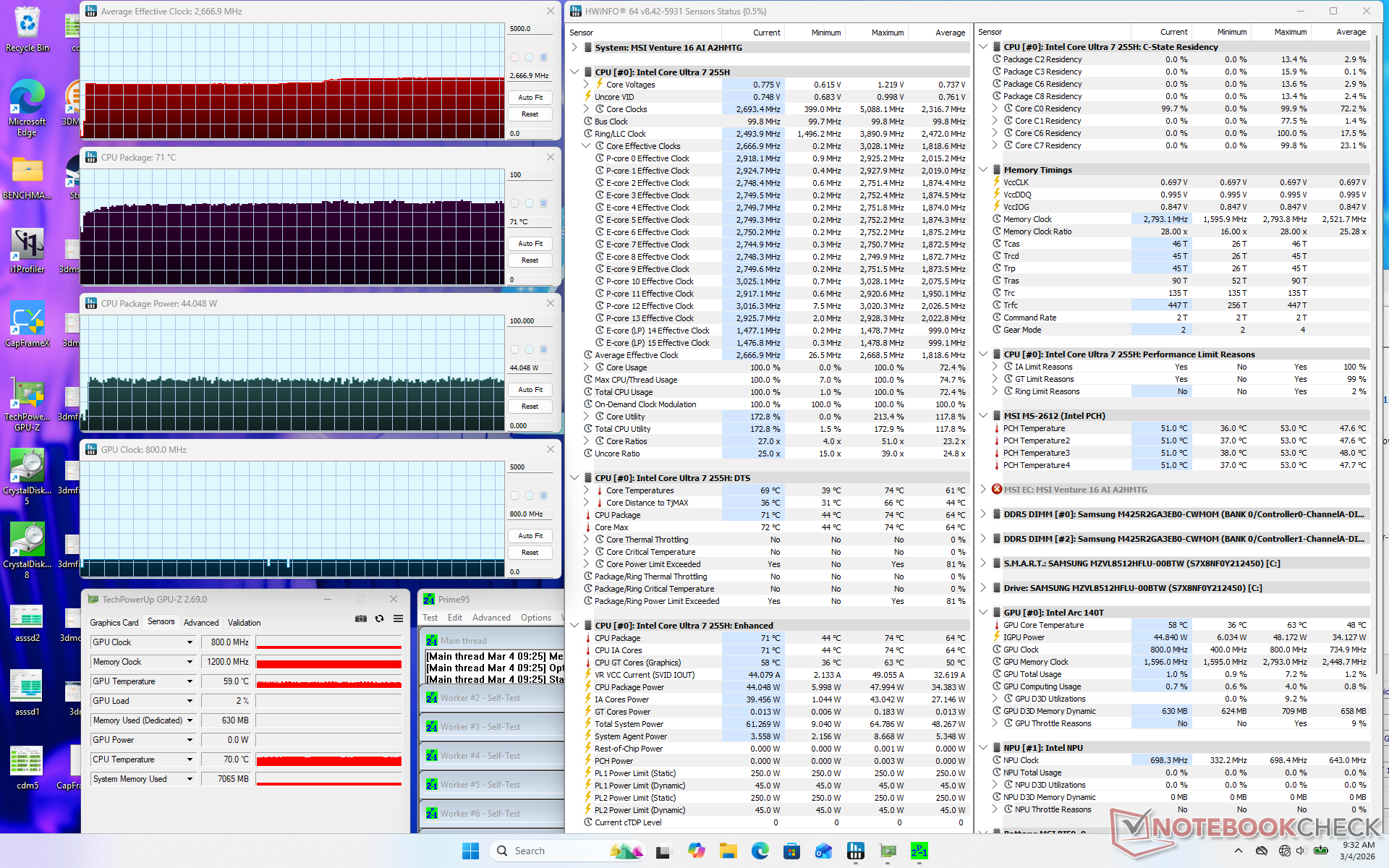 Processorn stabiliserades på 2,7 GHz, 71 C och 44 W när Prime95-belastningen inleddes. Kärntemperaturen låg kvar på låga 70 C även under belastning, jämfört med mitten av 80 C på Prestige 16 som var utrustad med en liknande CPU i Core H-serien.