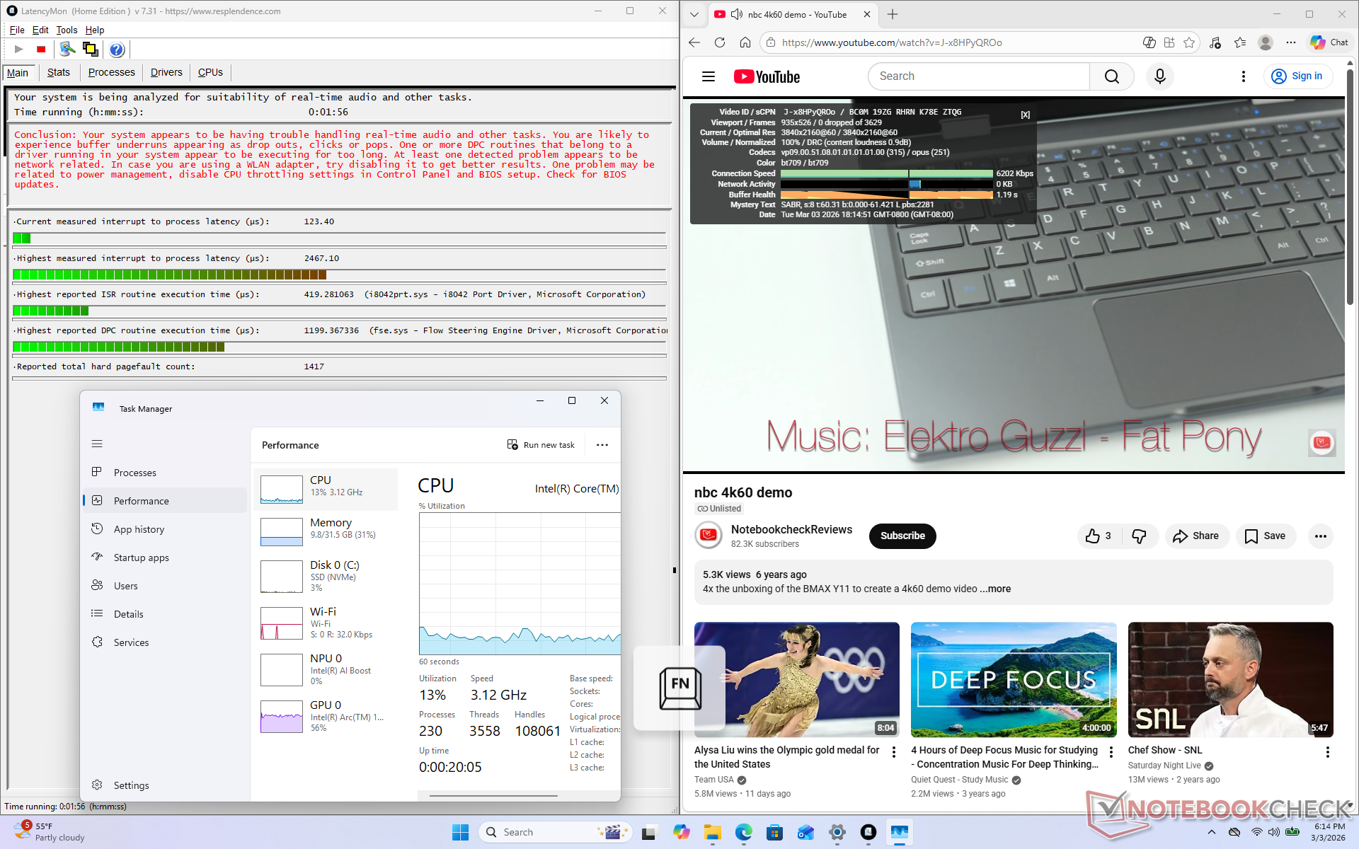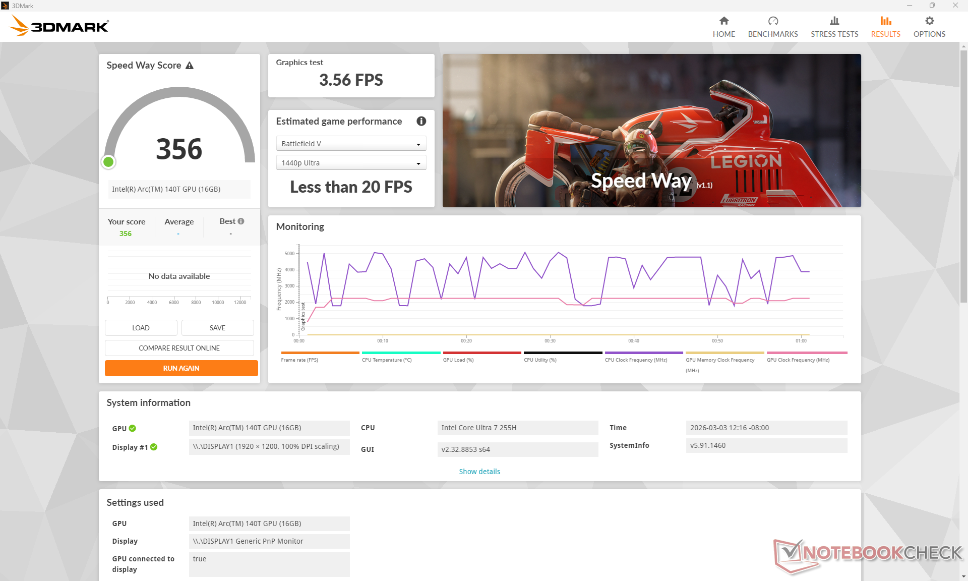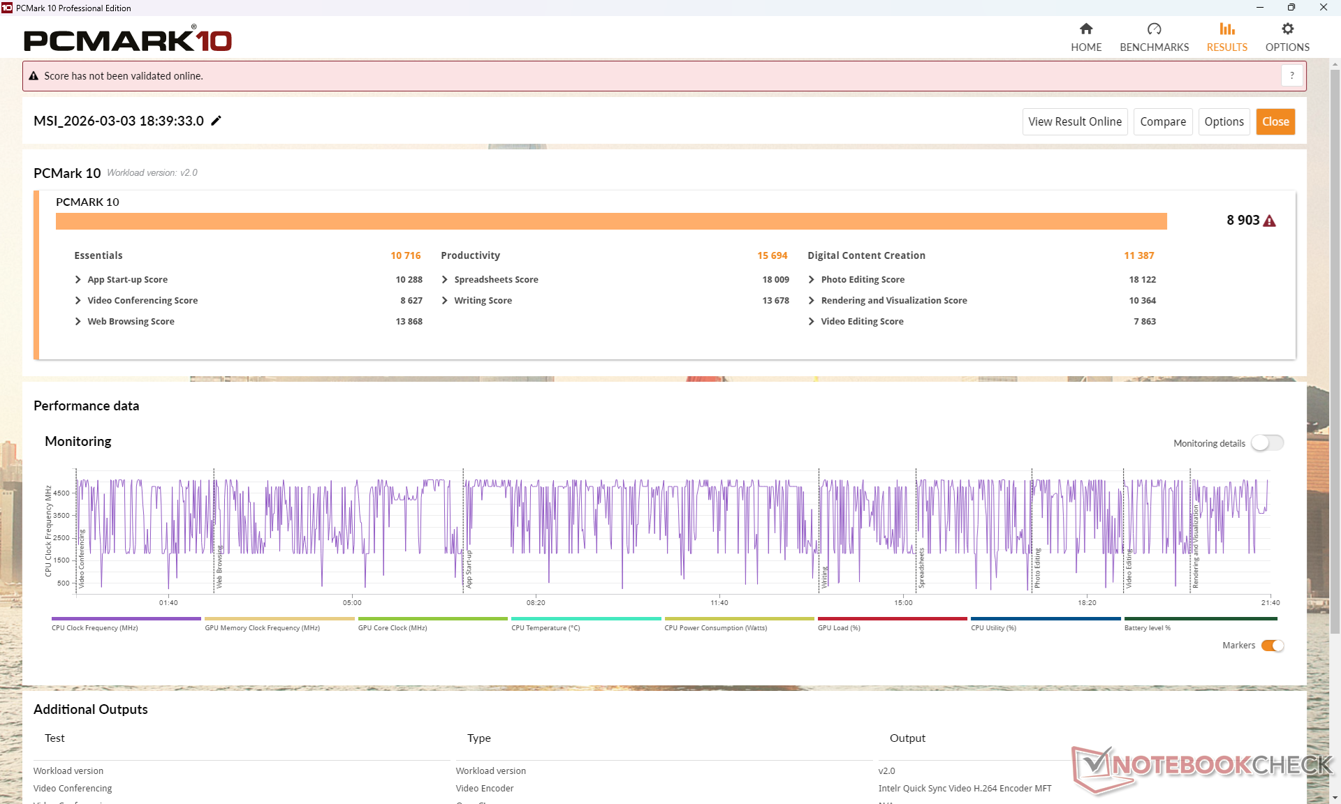 Processorn stabiliserades på 2,7 GHz, 71 C och 44 W när Prime95-belastningen inleddes. Kärntemperaturen låg kvar på låga 70 C även under belastning, jämfört med mitten av 80 C på Prestige 16 som var utrustad med en liknande CPU i Core H-serien.