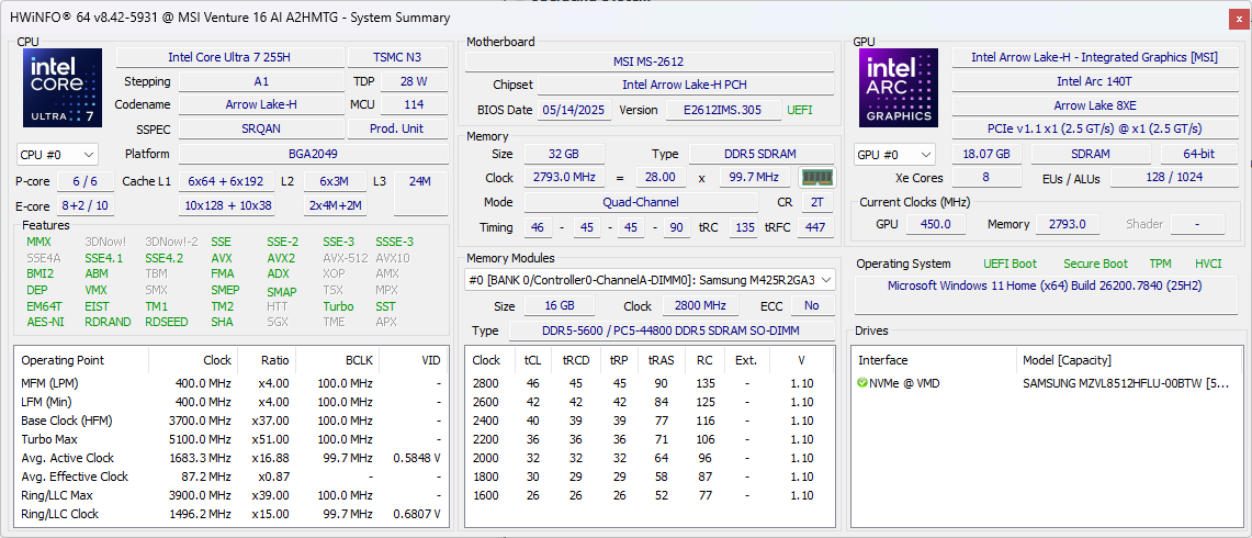 | MSI Venture 16 AI A2HMTG Intel Core Ultra 7 255H ⎘ Intel Arc Graphics 140T ⎘ 32 GB Minne | Amazon: Listpris: 1000 USD | 2.1 kg | 23.15 mm | 16.00" 1920x1200 142 PPI IPS | |