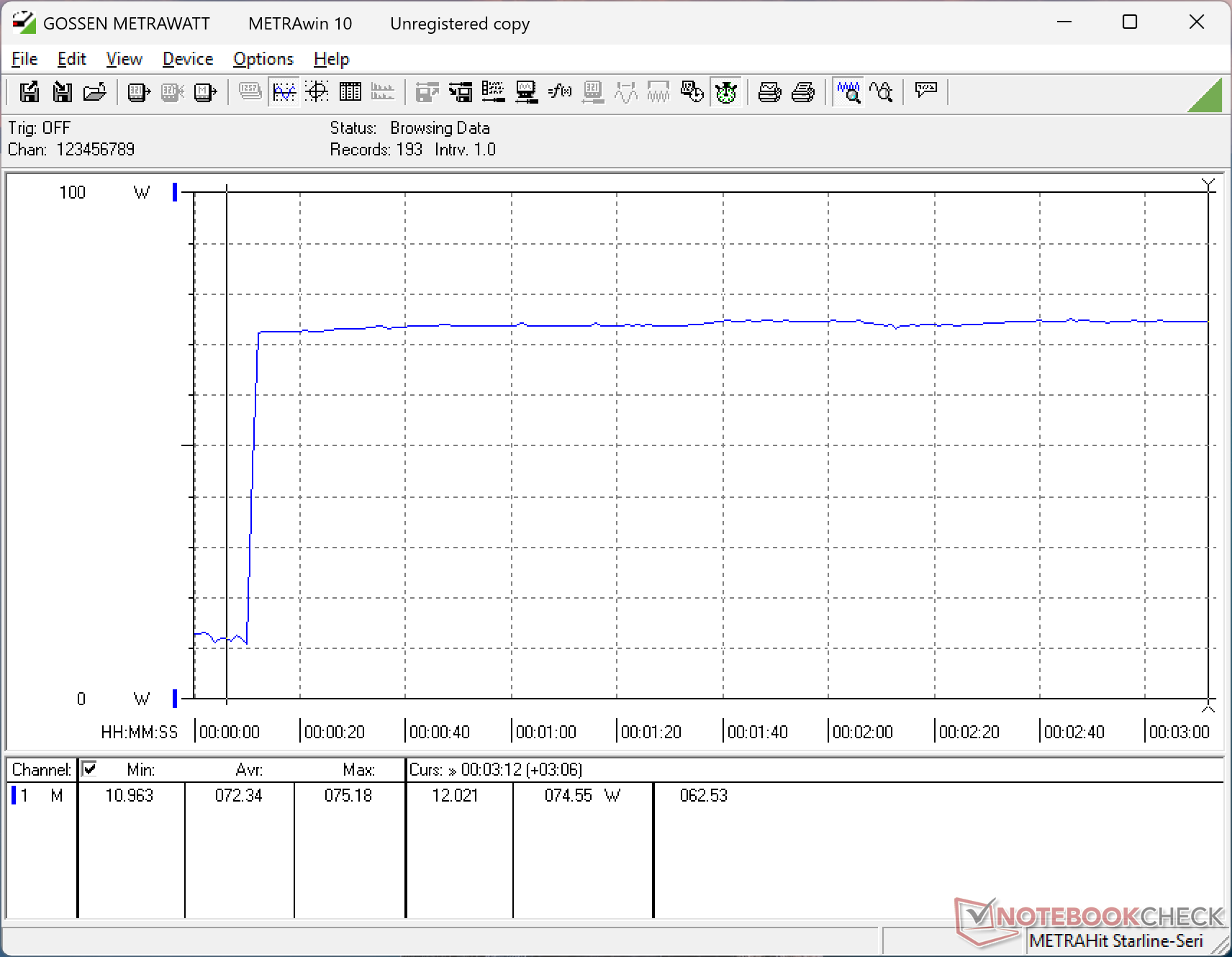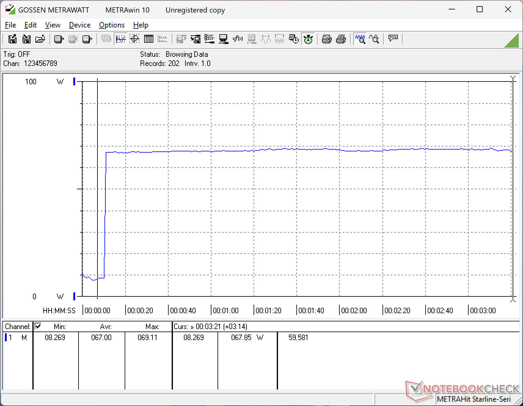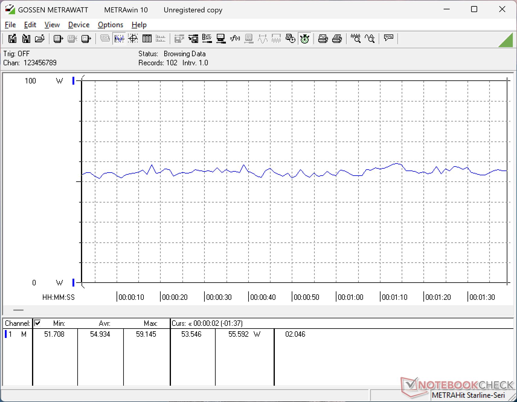 Den totala förbrukningen är generellt sett högre än många andra budgetorienterade 16-tums bärbara datorer, mycket tack vare den snabbare processorn i Core-H-serien. Att köra Prime95 skulle till exempel kräva nästan 70 W jämfört med bara 40 W på den Lunar Lake-V-drivna Dell 16 Plus.