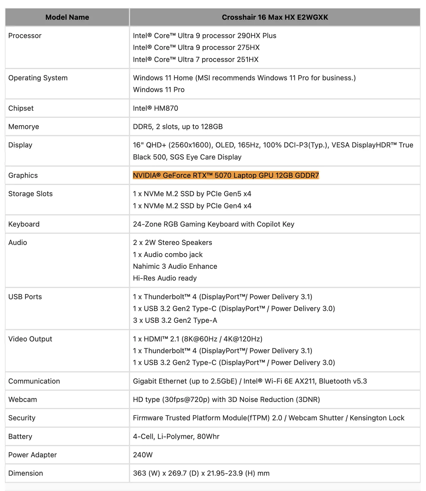 Dagens tillkännagivande innehåller också en hänvisning till en GPU som Nvidia ännu inte formellt har avslöjat. MSI nämner nämligen att dess Crosshair 16 Max HX E2WGXK är inställd på att vara tillgänglig exklusivt med 'Nvidia GeForce RTX 5070 Laptop GPU 12GB GDDR7'.