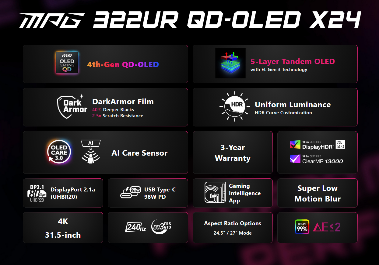 Panelmässigt är "X24"-modellen utrustad med en 4:e generationens tandem QD-OLED-panel (troligen från LG) byggd på EL Gen 3-teknik. Denna 5-skiktsuppsättning påstår sig öka ljuseffektiviteten med 30% samtidigt som den minskar strömförbrukningen. Skyddet hanteras av "DarkArmor"-filmen - MSI uppger att den ökar reptåligheten med 2,5 gånger och fördjupar svärtan med 40% - och en NPU-driven AI Care Sensor som dimmar skärmen när ingen mänsklig närvaro upptäcks för att förhindra inbränning. Den automatiserar pixelskyddet baserat på "miljömedvetenhet i realtid".