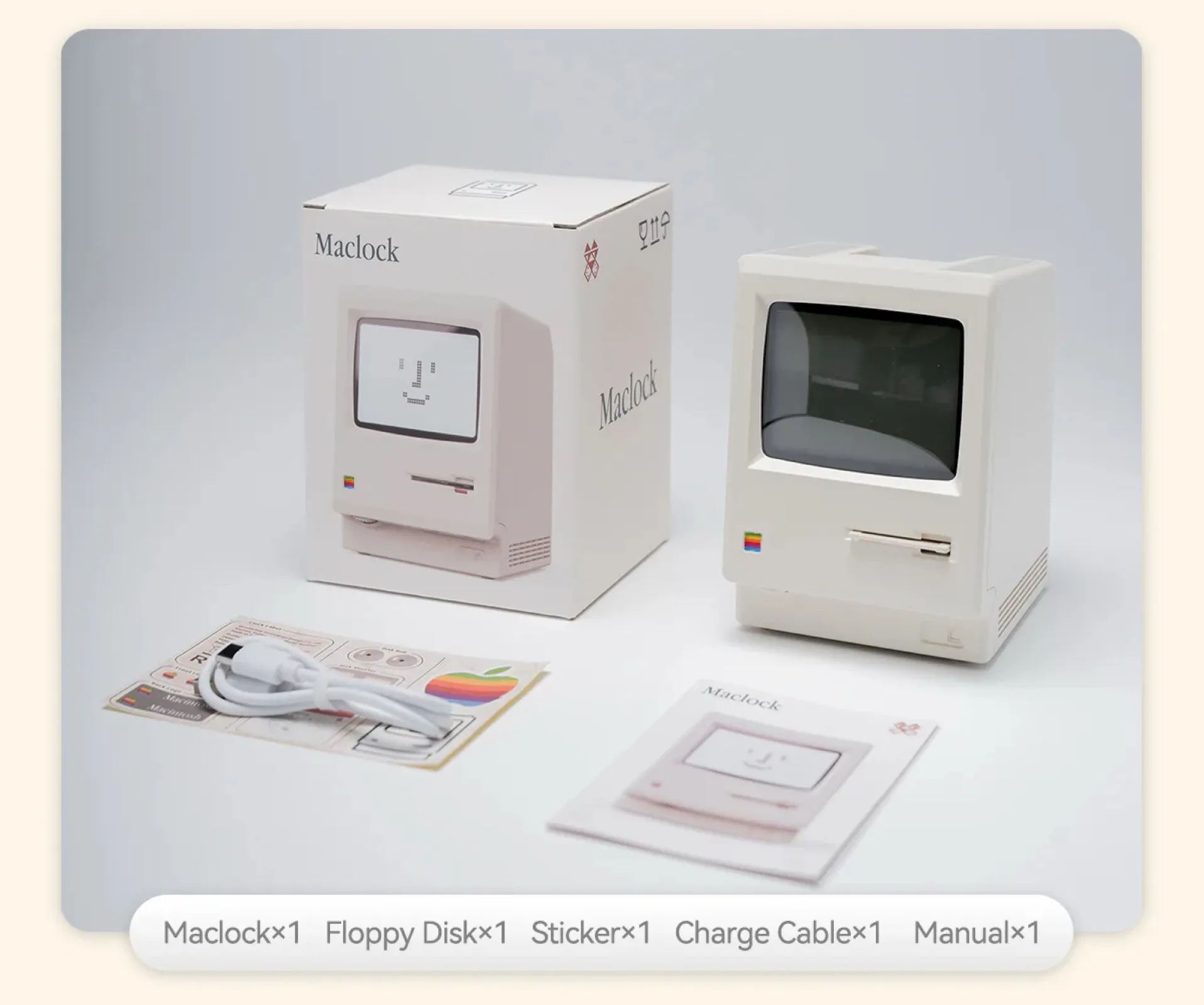 Displayen visar som standard tid och datum, men Maclock kan också användas som väckarklocka. Den digitala klockans hölje mäter 8 x 9,1 x 11,2 centimeter. Klistermärkena på baksidan av fodralet måste appliceras av köparen. Kokogol Maclock tillverkas endast i begränsade kvantiteter; när den är slutsåld kommer den inte längre att vara tillgänglig.