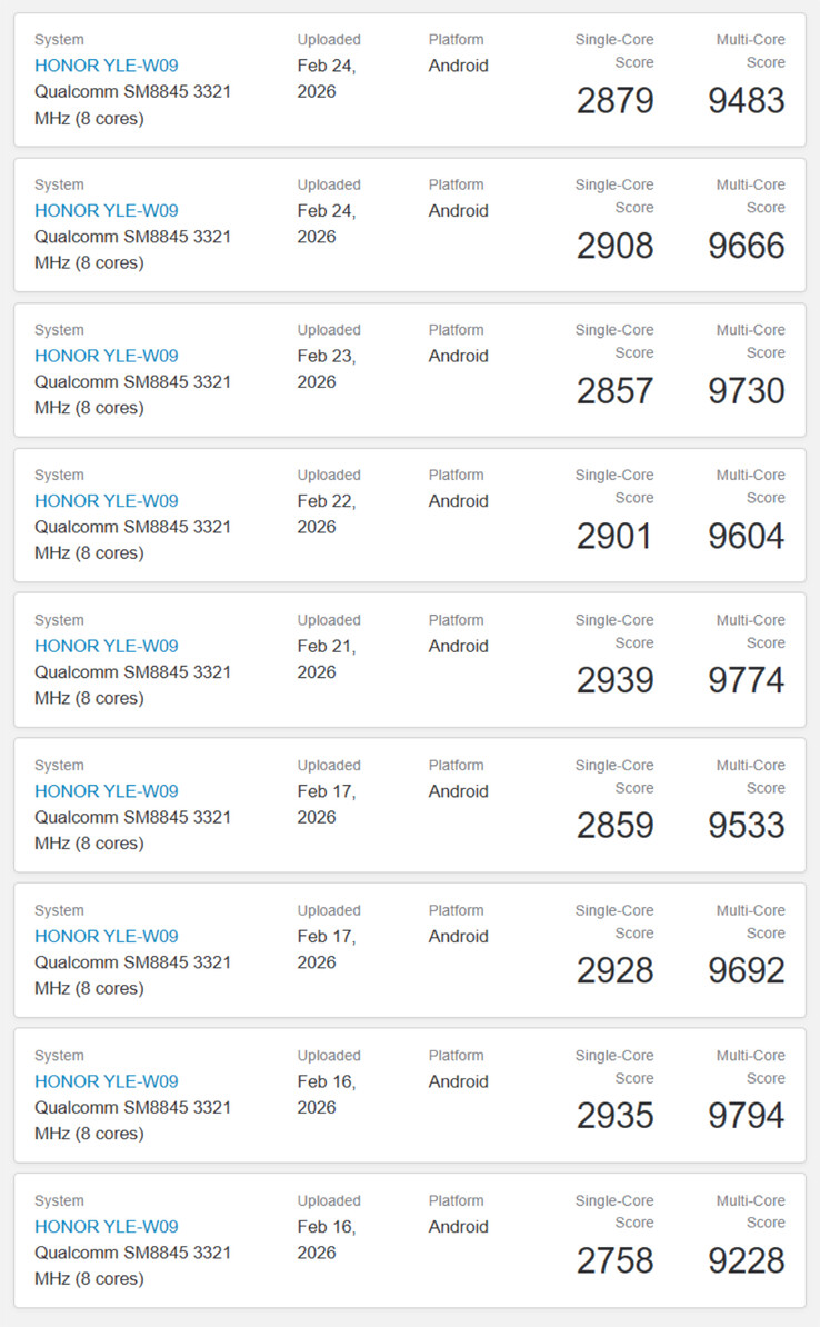 Som alltid tillhandahåller Geekbench ett modellnummer snarare än ett detaljhandelsnamn. Honor har dock redan bekräftat att MagicPad 4 är associerad med modellnumret "YLE-W09". Vi misstänker därför att de resultat som återges nedan har uppnåtts av recensenter inför den officiella lanseringen av surfplattan den 2 mars.