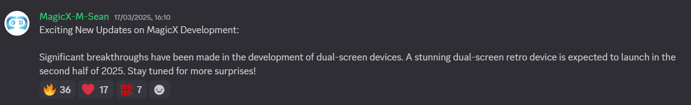 Dessutom har MagicX sagt att de har utvecklat en enhet med dubbla skärmar som kommer att lanseras under andra halvåret. Tyvärr har inga andra detaljer om denna enhet avslöjats ännu. Däremot är mer känt om två handhållna spelkonsoler med musselskal.