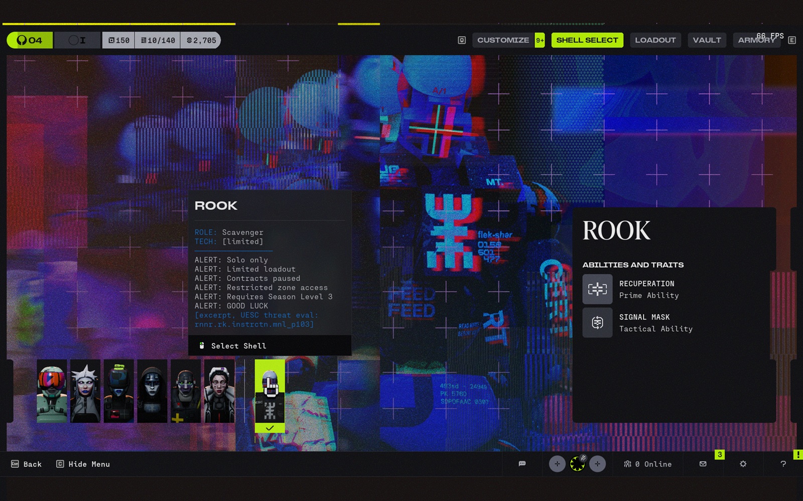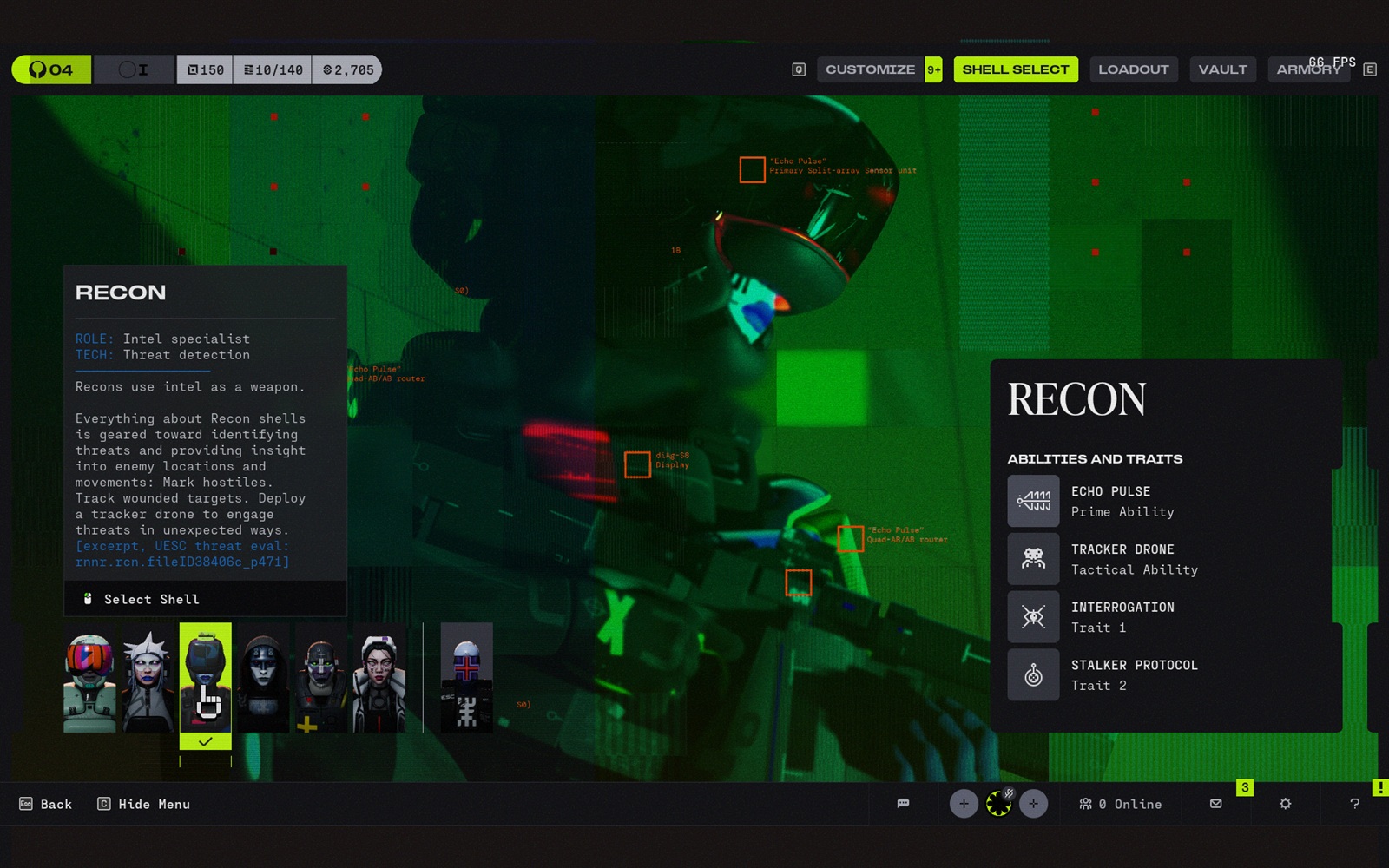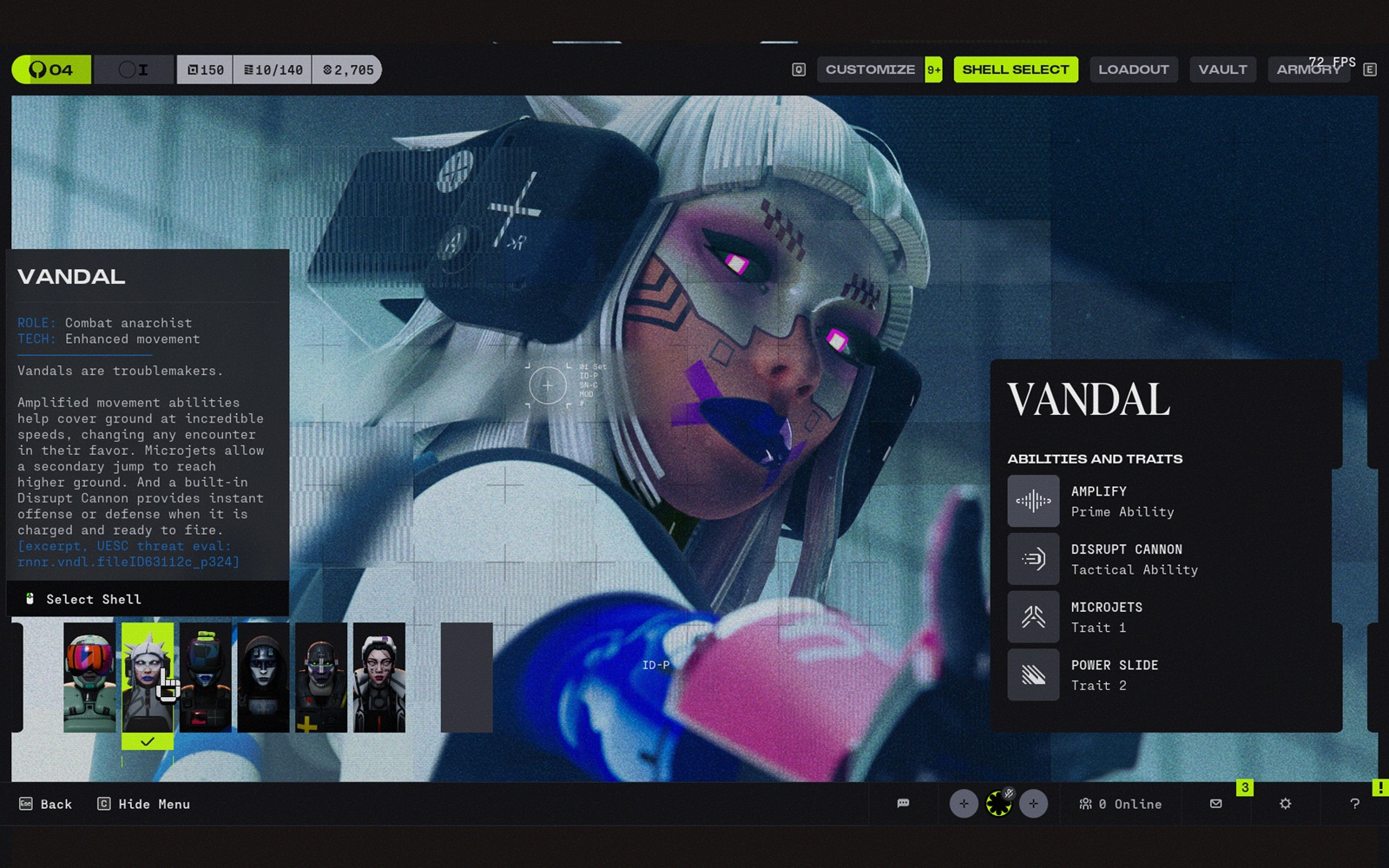 Den visuella identiteten kommer igenom utanför matcher också. Skalskärmarna som visas före matcherna ser snygga, bepansrade, syntetiska och lite opersonliga ut, mer som specialiserade kroppar tillverkade för funktion än heroiska karaktärer byggda för självuttryck. Den mörka pläteringen, de hårda silhuetterna, de visirtunga designerna och de neoninramade menyerna förstärker samma idé: de är verktyg som används i ett fientligt system. Det passar Marathonsvärld mycket bättre än vad en mer konventionell hero-shooter-presentation skulle ha gjort.