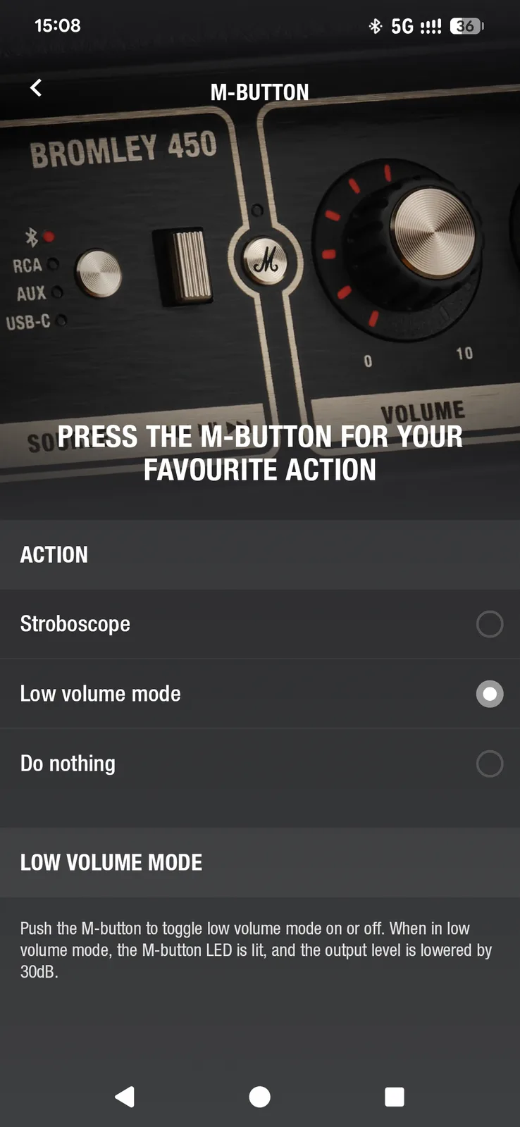 För tystare miljöer - som en balkong eller mer avslappnade miljöer - finns det ett lågvolymläge som minskar ljudet med 30 dB. Om du vill kan du tilldela den här funktionen till M-knappen.