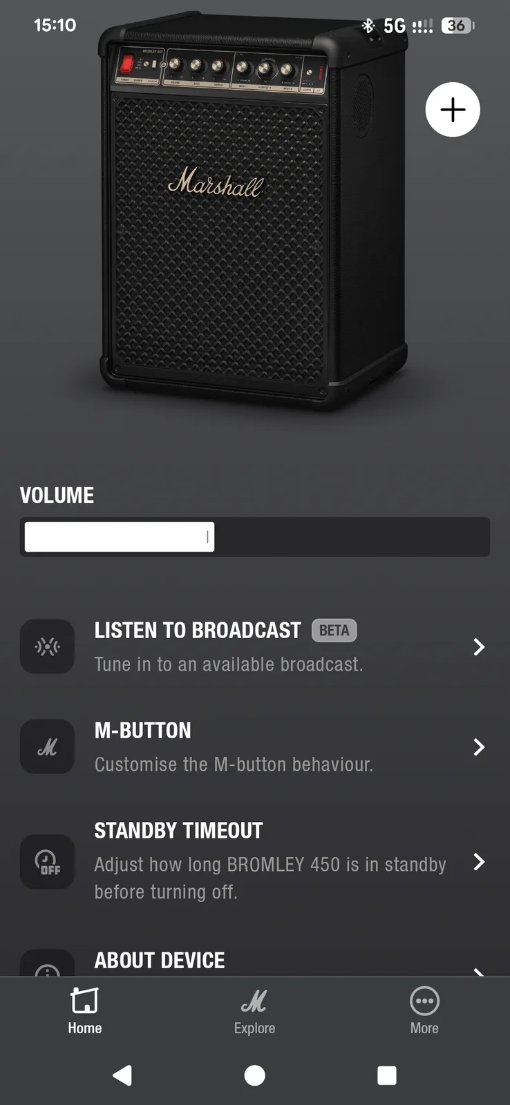Bromley använder samma app som Marshalls hörlurar. Marshalls Bluetooth-app ser snygg ut och är lätt att navigera i, men den saknar funktioner. Du kommer främst att behöva den för Auracast (länka flera kompatibla högtalare) och konfigurera M-knappen, som för närvarande bara stöder en av två tilldelningsbara funktioner. Utöver volymkontroll finns det inte mycket du kan justera på distans - ingen EQ, inga diskant- eller basjusteringar.