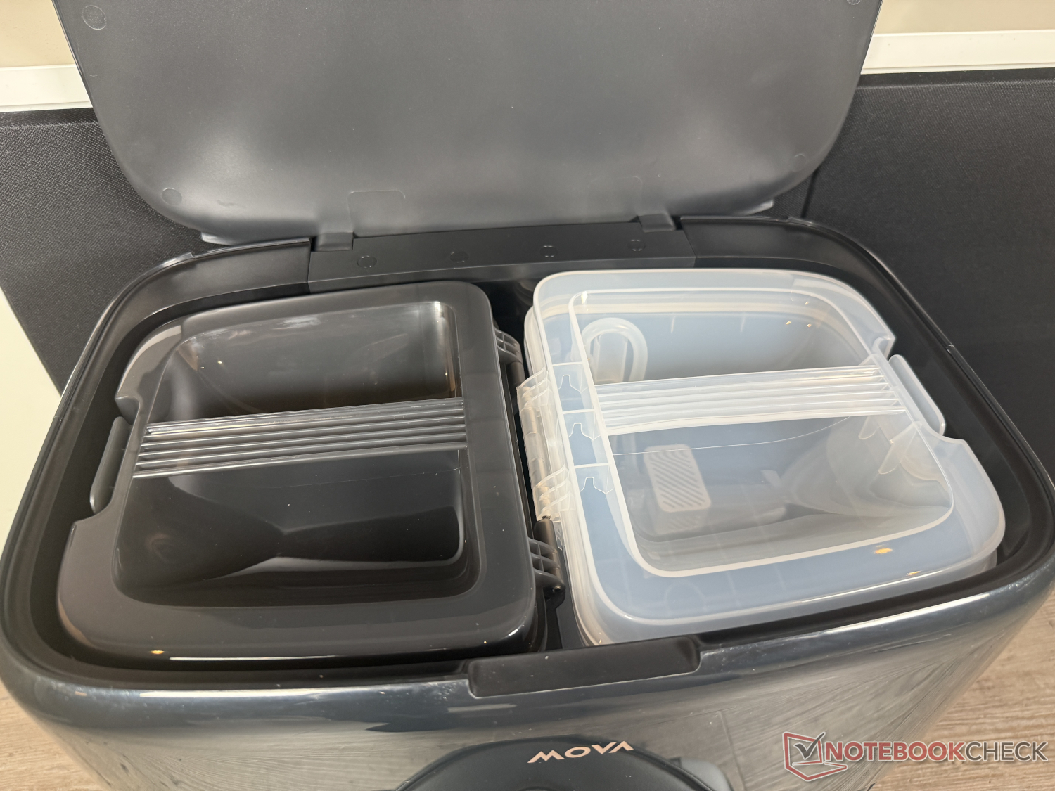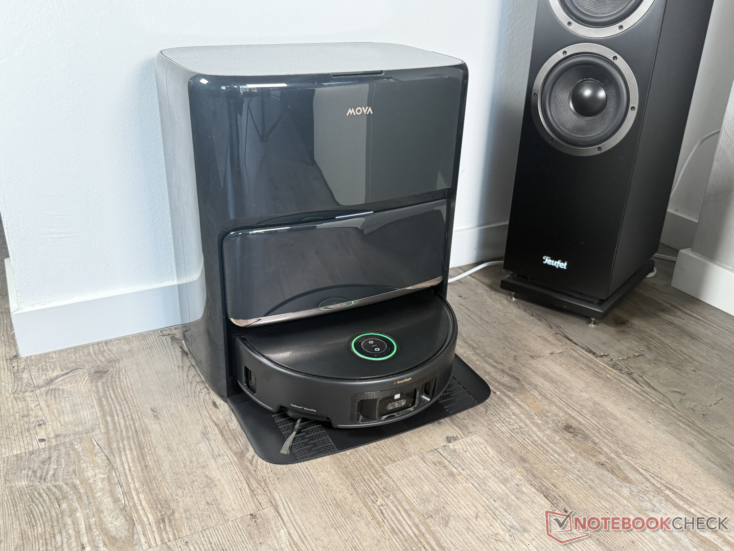 Naturligtvis ingår också basstationen i den välkända Mova-designen. Den rengör inte bara dammbehållaren i en 3,2 liters dammpåse. Den tar också hand om rengöringen av moppningsfunktionen. Mova använder vatten med en något lägre temperatur på 80°C än Dreame. Detta påverkade dock inte riktigt den visuella renheten hos mopprullen i testet. Därefter används varmluft för att torka den. Dessutom kan UV-sterilisering aktiveras via appen och två rengöringsmedel kan doseras automatiskt.