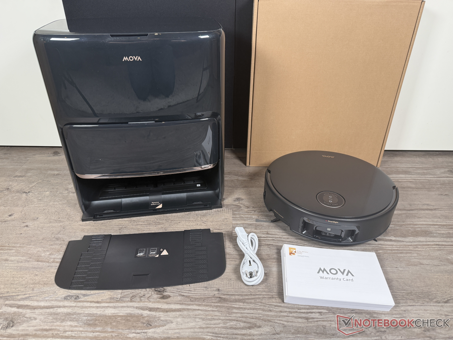 Mova Z60 Ultra Roller i Complete-versionen levereras också med ett omfattande leveransomfång. Förutom roboten och basstationen ingår fyra dammpåsar och rulltorkare, två huvudborstar, tre sidoborstar, fyra dammfilter (vart och ett installerat en gång, resten byts ut) samt 1 liter rengöringslösning och 200 ml borttagare av husdjurslukt.