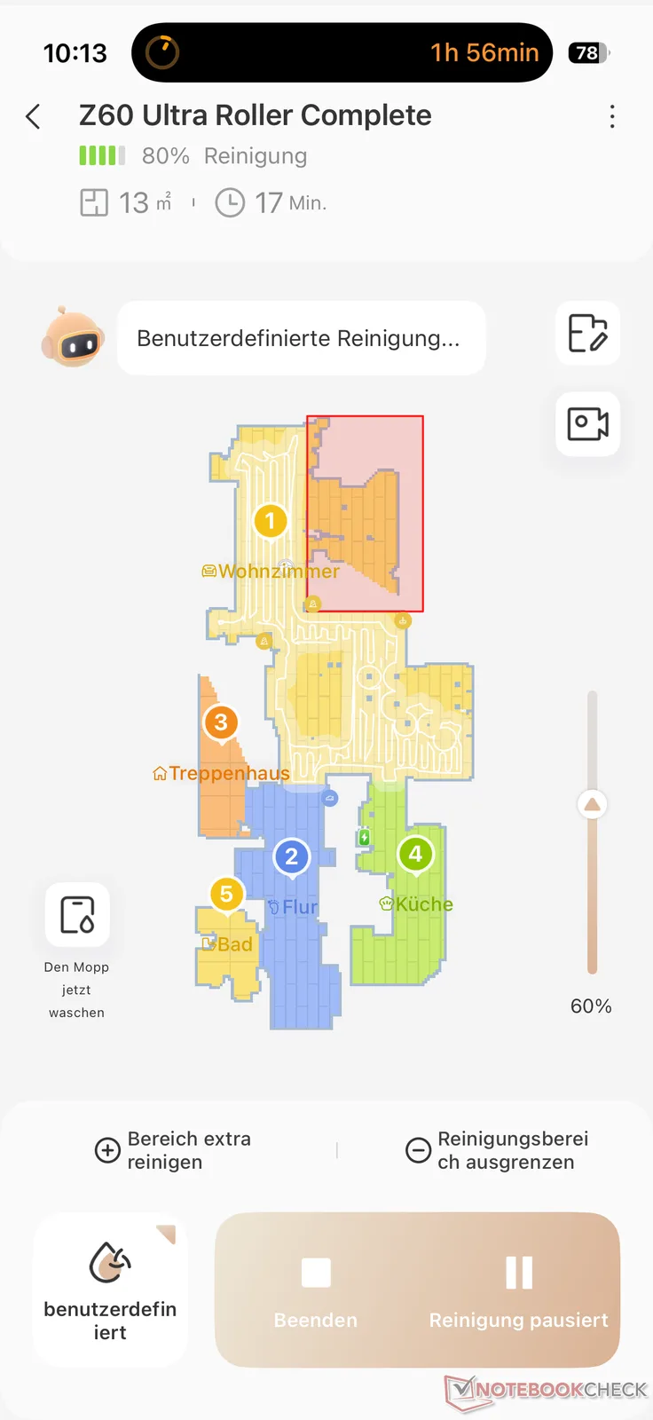 Vi har också mycket positivt att säga om moppningsfunktionen. I allmänhet moppar robotdammsugare med en rullösning mer noggrant än de klassiska modellerna med två roterande moppar, vilket vår testerfarenhet visar. Detta gäller även Mova Z60 Ultra Roller.