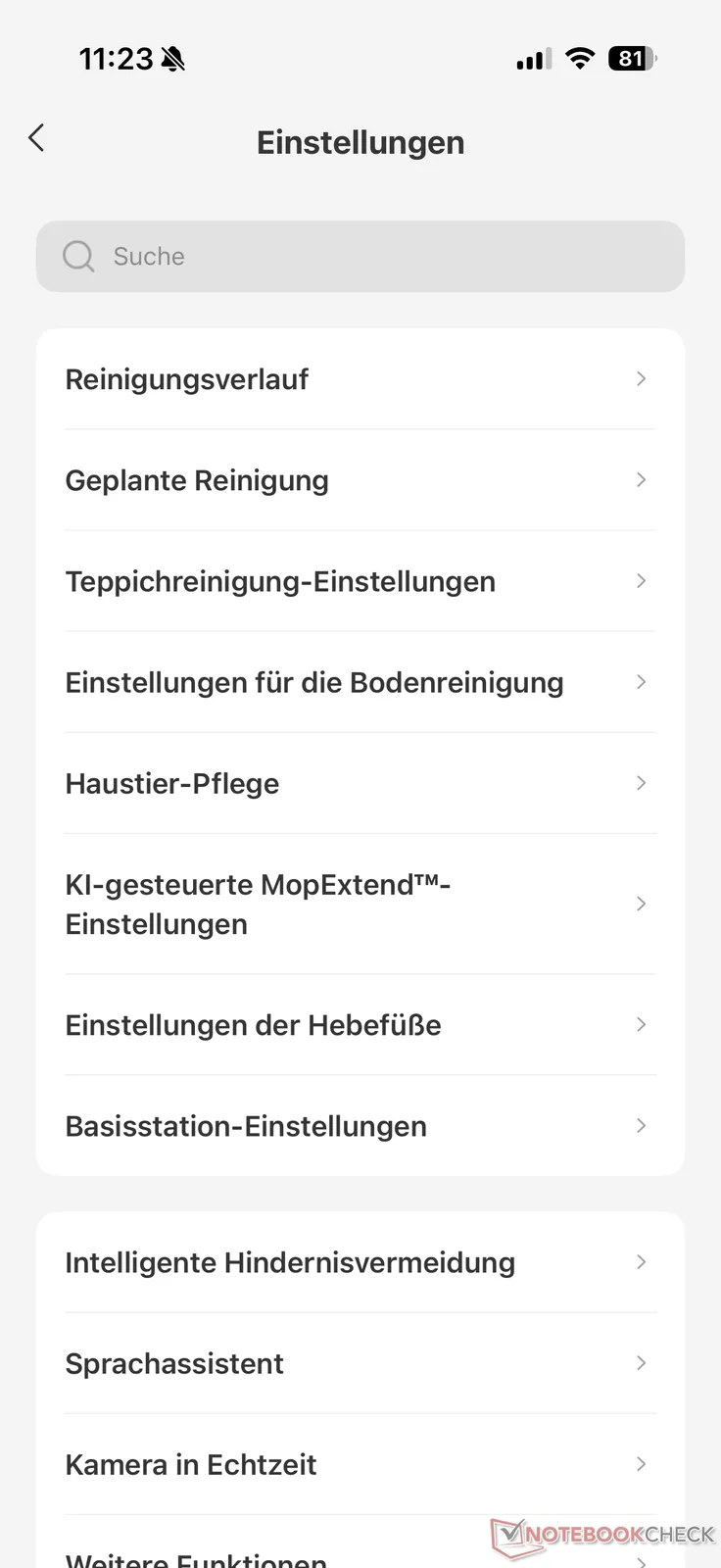 Olika alternativ finns tillgängliga i menyn för att ställa in robotdammsugarens och stationens beteende. Förutom den egna röstassistenten, som också talar tyska, avrundar schemalagda rengöringar och en livevideofunktion funktionerna i den framgångsrika Mova-appen. Det enda vi saknade här var Matter-support.