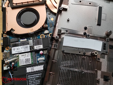 För att komma åt de interna komponenterna måste du ta bort 14 stjärnskruvar av samma storlek. Basplattan av plast kan sedan enkelt lyftas av. Undertill hittar du ett kylsystem med mycket koppar, ett skruvat batteri, två RAM-kortplatser, SSD-enheten som kyls av två kuddar och den utbytbara WiFi-modulen.