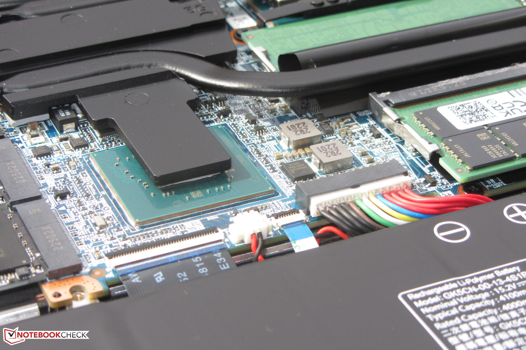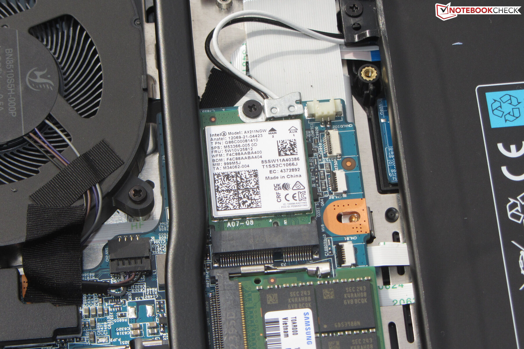 Efter att ha tagit bort alla skruvar på enhetens undersida kan bottenskalet lossas med hjälp av en platt spatel eller en fogslätare. Du har då tillgång till de två RAM-platserna (båda upptagna), de två SSD-enheterna (PCIe 4, M.2-2280), WLAN-modulen, fläktarna, BIOS-batteriet och batteriet till den bärbara datorn.