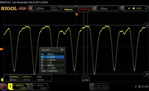 Med hjälp av ett oscilloskop uppmätte vi ett basflimmer på cirka 360 Hz. Dessutom använder Vivo högfrekvent PWM-dimning med en frekvens på 2 083 Hz när ljusstyrkan på telefonens display är inställd på minimum. Detta, tillsammans med den platta amplitudkurvan, bör bidra till att undvika obehag för de flesta människor, men det kan inte helt uteslutas för känsliga individer.