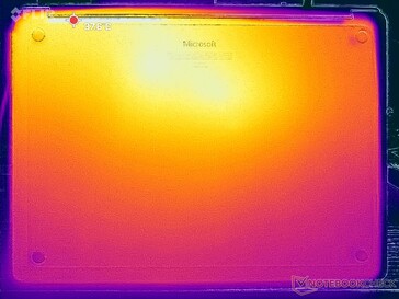 Yttemperaturerna kan bli ganska varma på grund av metallkonstruktionen och avsaknaden av ventilationsgaller längs bottenkåpan. Hot spots när du kör krävande belastningar kan nå över 40 C och 37 C på tangentbordets mitt respektive botten, jämfört med 41 C till 47 C på Lenovo Yoga Slim 7 15. Värmen från handledsstöden är märkbar under användning men inte tillräckligt för att vara obekväm eller distraherande eftersom värmepunkterna i allmänhet är mot enhetens baksida istället.
