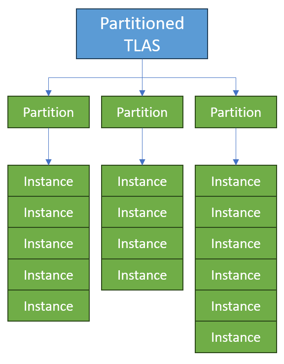 Partitioned TLAS tar samma metodik som används för klustrad geometri och tillämpar den på spelscener. I det här fallet kan hela spelscenen delas upp i mindre grupper, som GPU:n lättare kan manipulera med nya strålspårningselement. Detta snabbar upp prestandan för strålspårning avsevärt, eftersom GPU:n bara kan strålspåra de synliga eller nödvändiga elementen från hela scenen.
