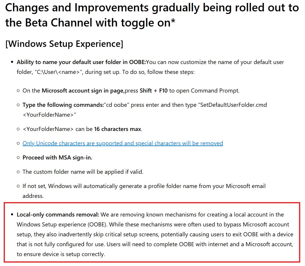 I de tidigare versionerna blockerade företaget det populära kommandot OOBEbypassnro, som gjorde det möjligt för användare att hoppa över en del av den första installationsprocessen. Detta möjliggjorde så småningom skapandet av ett offline-konto. Nu har Microsoft fördubblat sin hållning.