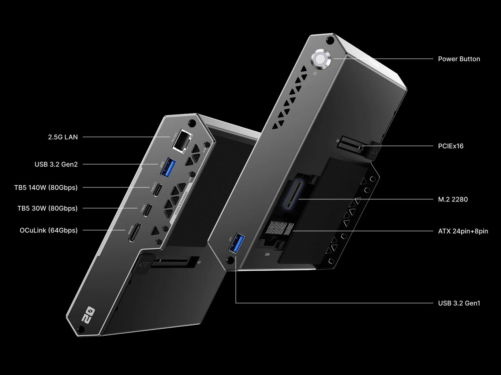 Å ena sidan lägger DEG2 till två Thunderbolt 5-portar utan att offra OCuLink-anslutning som Peladn Link S-3. Enligt Minisforum ger båda Thunderbolt 5-portarna 80 Gbps bandbredd, men med samma 64 Gbps som erbjuds till grafikkort via PCIe 4.0 x4 som OCuLink. Dessutom, även om en Thunderbolt 5-port levererar upp till 140 W laddning, toppar den andra på ynka 30 W.