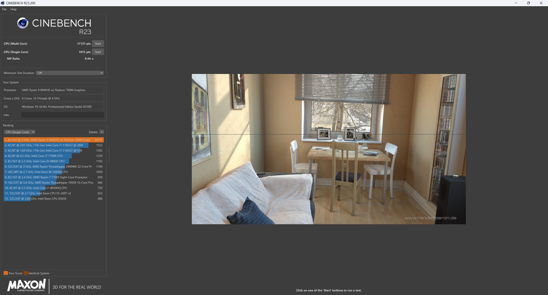 Minisforum EliteMini UM890 Pro använder AMD Ryzen 9 8945HS med 8 Zen4-kärnor. APU:n arbetar med 65 watt under en kort tid och 54 watt på lång sikt, vilket återspeglades i Cinebench R15 Multi uthållighetstest. Den höga strömförbrukningen blev särskilt tydlig under riktmärkena med flera trådar, medan dess enkärniga prestanda knappt gynnades. I rankningen kom den bakom Minisforum AI X1 Pro med Ryzen AI 9 HX 370.